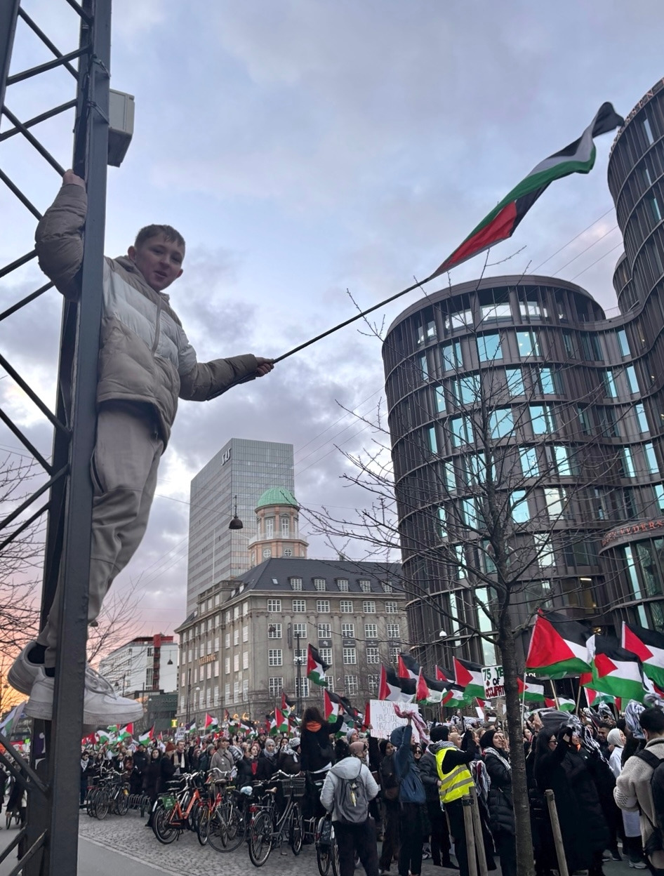 나는 코펜하겐 광장에서 코펜하겐 기차역까지 걸어가는 내내 광활하고 거대한 시위대를 보았다. 길을 걸어가며, 탑 위에 올라가 팔레스타인 깃발을 들고 있는 용맹한 남자아이와 눈을 마주쳤다. 그 아이는 손에 펄럭이는 자신감을 들고, 초롱초롱한 희망의 눈빛을 반짝였다. 생동하는 아이의 움직임이 내 눈에 형형히 박혔다. 우린 코펜하겐 지하철까지 걸어가며 경계 없는 시위대 곁을 따라 팔레스타인을 위한 구호를 외치며 걸어갔다. 현재 안과 밖에서 전쟁을 겪는 이에게 코펜하겐에 모인 모든 사람들의 힘이 소실되지 않고 직통으로 전송되었으면 하는 바람으로.