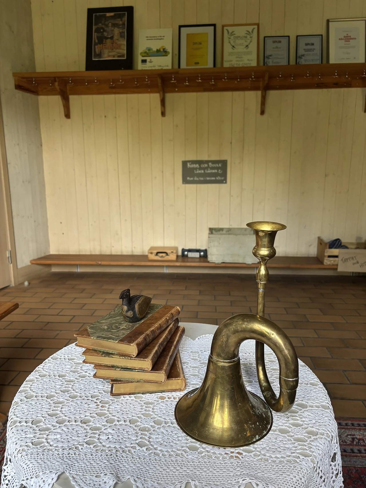 친구들과 화장실을 기다리며, 트럼펫으로 만들어진 촛대를 보았다.