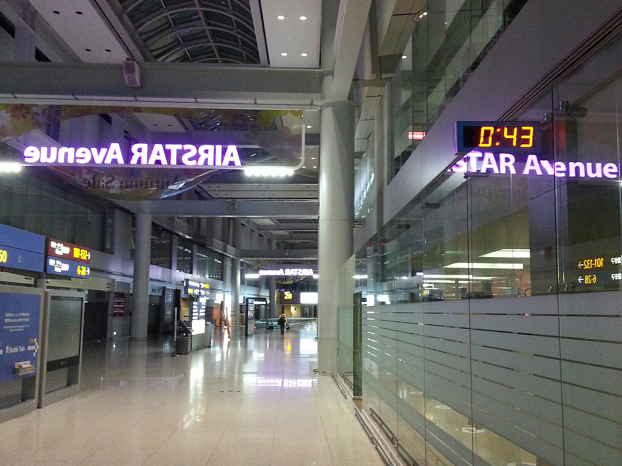 분당에서 공항 리무진 막차를 타고 인천 공항에 오니 22:00. 입국 수속을 다 마치고 외국 항공사가 있는 탑승동으로 전철을 타고 이동하니 23:00. 출발시간 01:50 까지는 시간이 너무 많이 남아 있다.