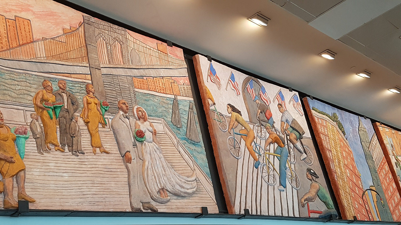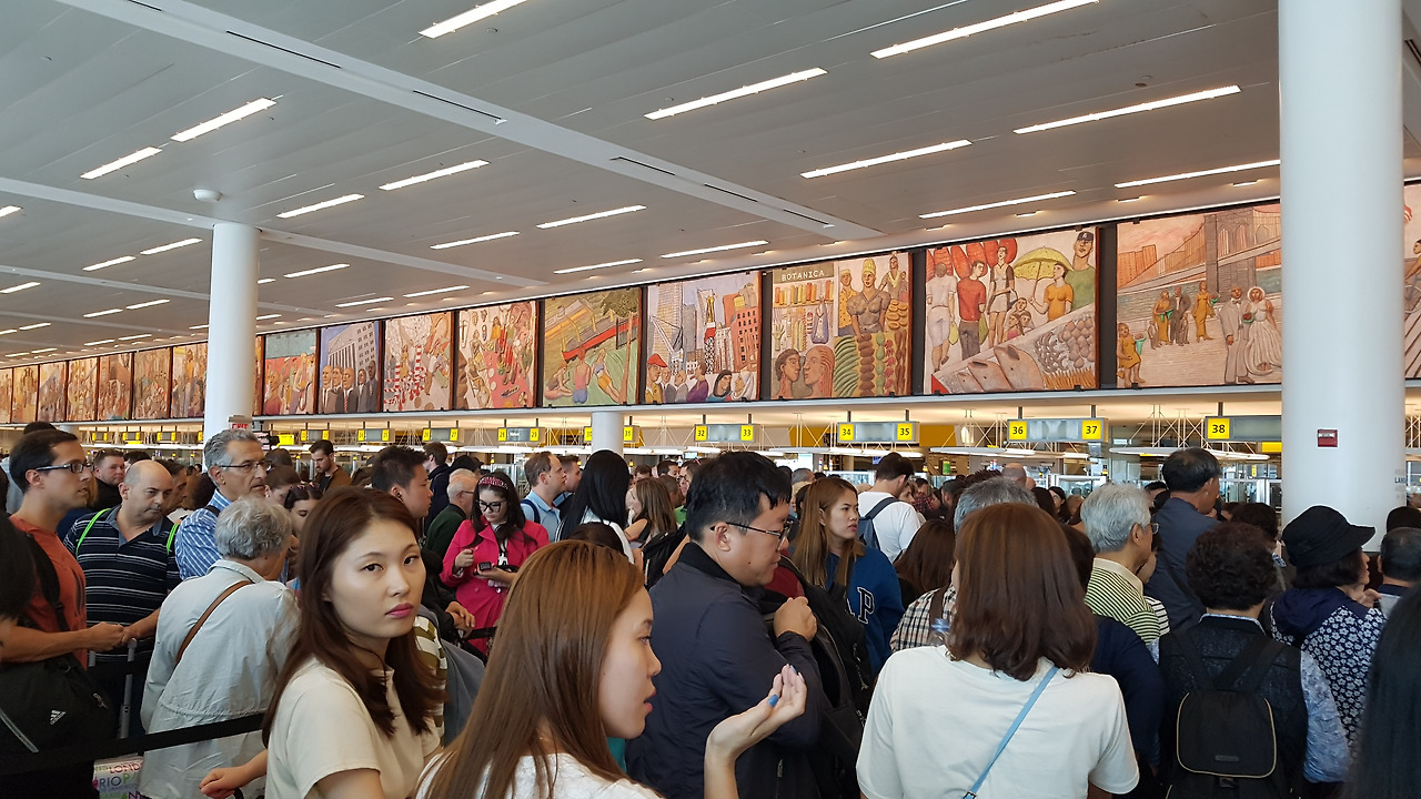 입국장에 들어서니 세계 최대의 도시 뉴욕의 관문 JFK 공항답게 어마어마하게 많은 세계 각국의 입국자들로 붐비고 뉴욕의 문화와 역사를 형상화한 벽화는 이곳이 뉴욕임을 알려준다.