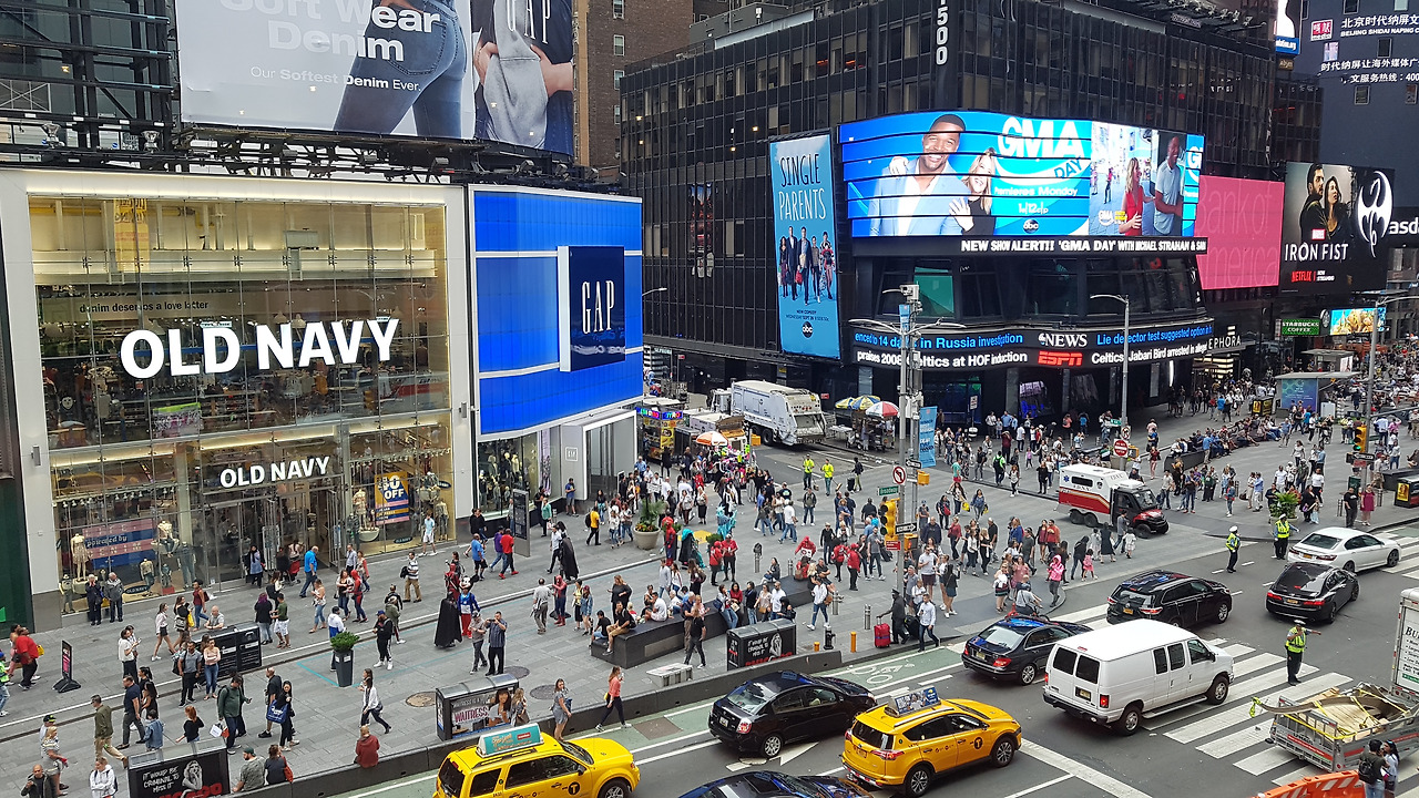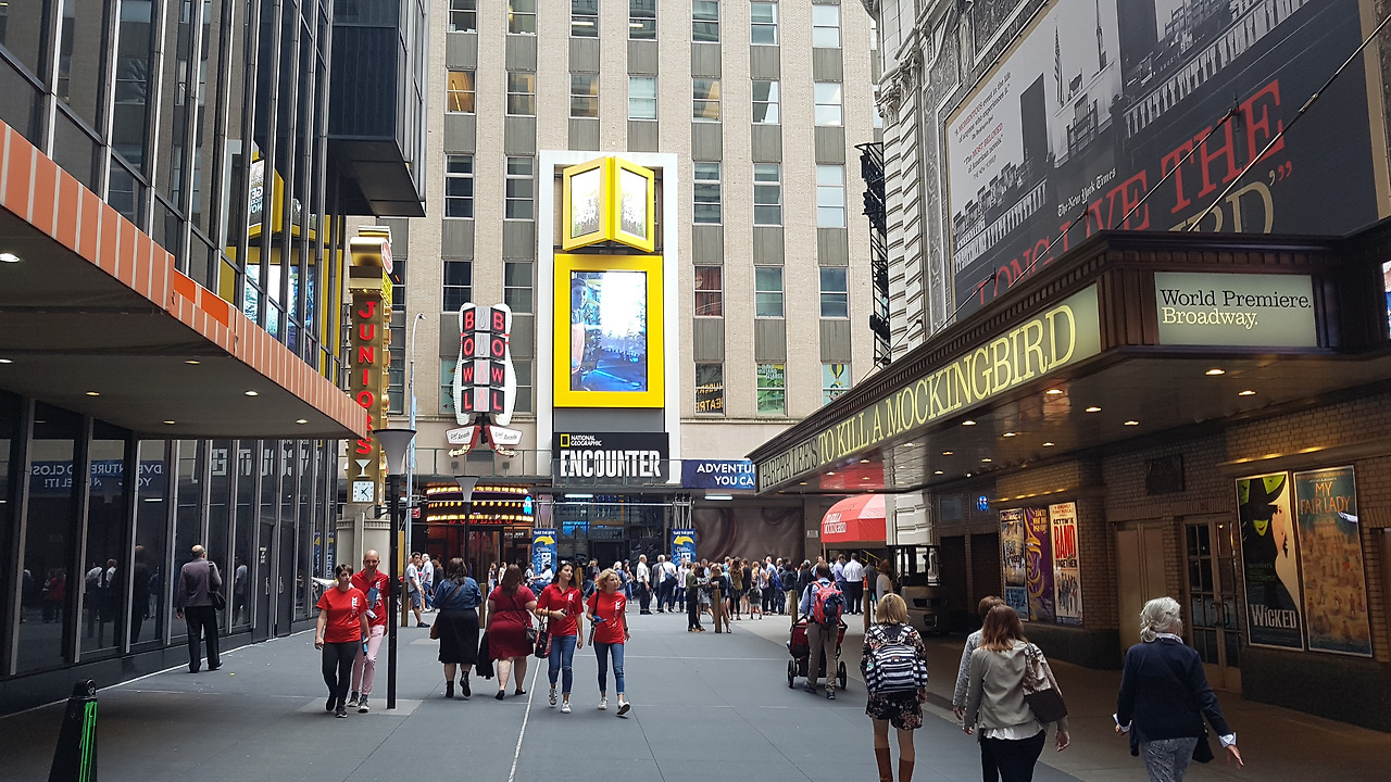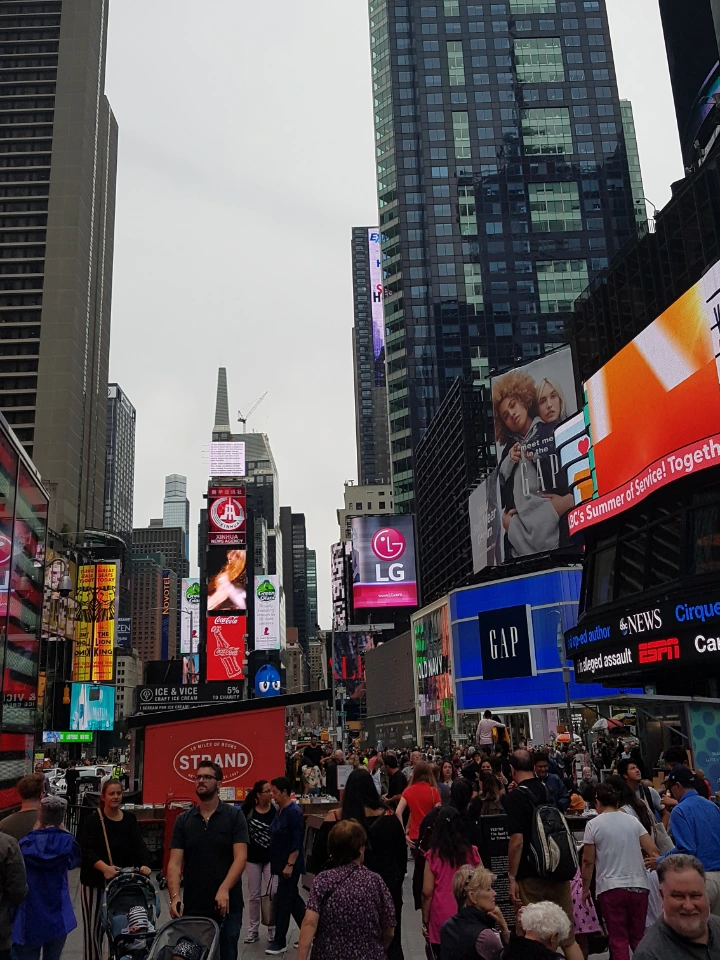 뮤지컬 관람을 마치고 빠져 나오면서 극장 2층에서 바라본 타임스퀘어는 여전히 많은 사람들로 붐비고 밤에 보았던 현란한 빛의 향연에는 미치지 못했지만 기술의 발달로 한낮에도 빛을 발하는 LED 광고판의 선명한 색상이 인상적 이었다.
