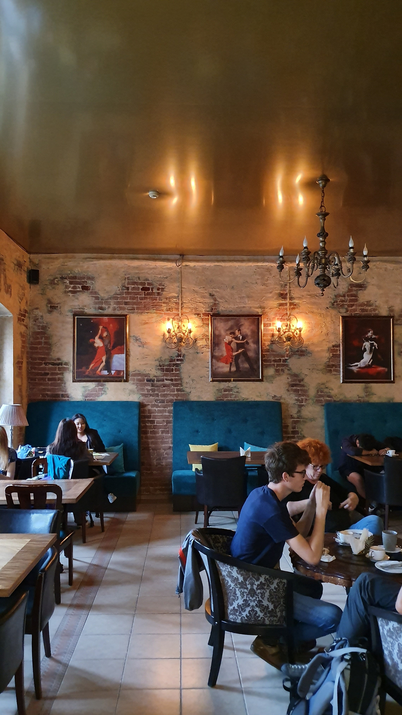 피자맛 치즈맛, 열대 과일맛, 바나나, 초코맛 4가지에 양도 넉넉한 팬케익이 음료 포함 2만원이 채 안되니 가성비가 좋은 먹방 투어다. 반이상이 한국 사람들이라 러시아 있는지 우리나라에 있는지 혼돈 스럽지만 팬 케이크의 내용물이 창조적이며 맛도 좋은 편이었다. 식당내부 벽화 인테리어도 멋지고 추천하고픈 맛집이다.