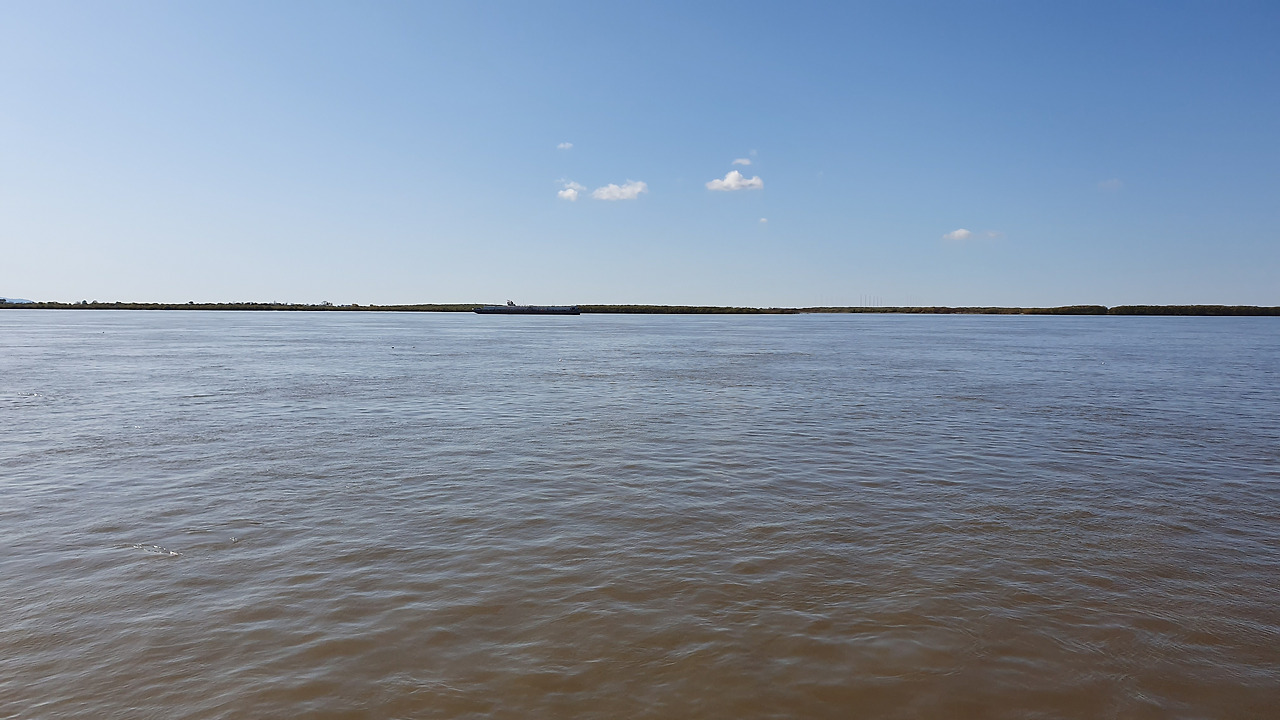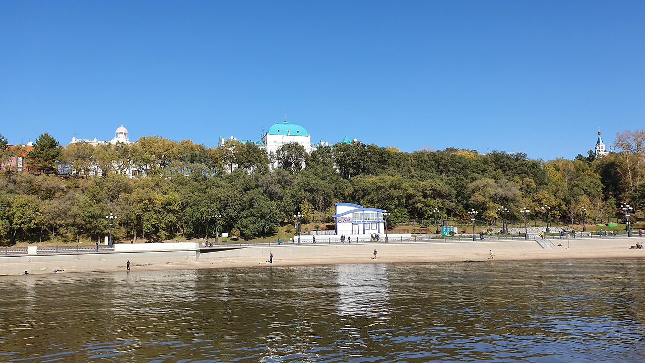아무르강이 몽골에서 발원하여 중국과 러시아를 거쳐 오호츠크해로 흘러드는 4천3백여 킬로미터 길이의 거대한 강이기도 했지만 하바롭스크의 지형적 위치가 블라디 보스토크 위쪽에서 발원한 또 하나의 거대한강 우수리강이 아무르강과 합류하는 유역 이라고 했다. 그래서 그런지 강폭의 규모가 어마어마 했고 바다가 아니면 보기힘든 수평선을 강에서 만날 수 있다는 사실이 신기하기 까지 했다.
