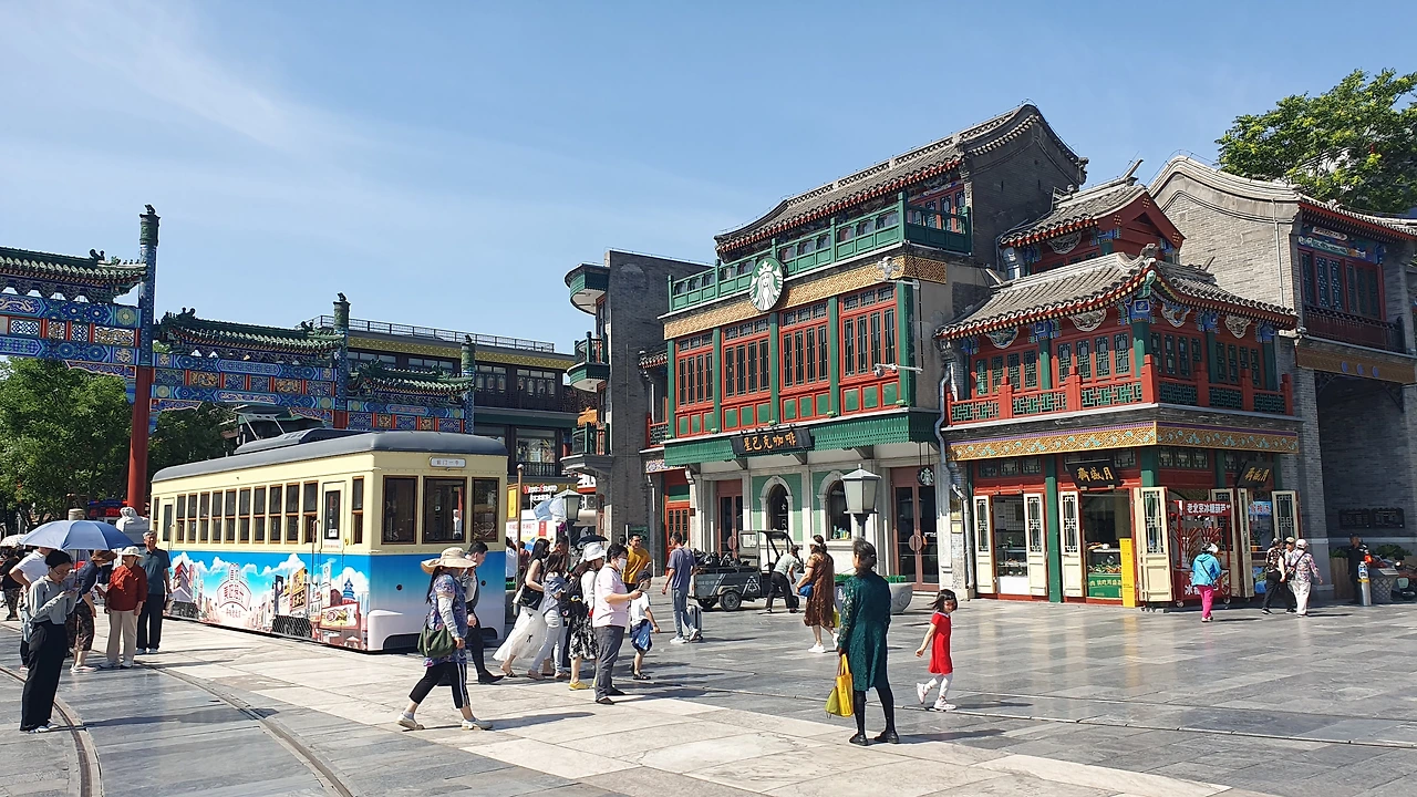 양옆으로는 붉은 등롱이 드리워진 상점들이 이어지고, 그 사이사이로 개화기적 정취를 풍기는 전차가 어슬렁거린다. 오래된 기와 건물 아래 자리한 스타벅스의 간판이 묘한 이질감 속에서 여러시대가 혼재한 듯 보인다.