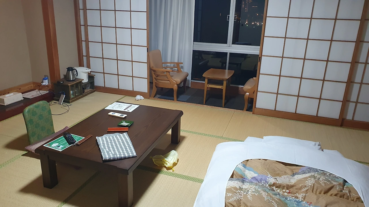 다다미 향이 은은히 배인 청결한 방, 혼자 쓰기엔 큰 방이다. 무엇보다 창밖으로 들려오는 강물 소리와 철교를 건너는 기차 소리가 여행 첫날의 지친 몸과 마음을 다독여 주었다. 문득 영화 박하사탕 속 한 장면이 떠올랐다.철교 위 설경구의 외침처럼,“나… 다시 돌아갈래…” 그 소리가 강 건너편 어딘가에서 울리는 듯했다.