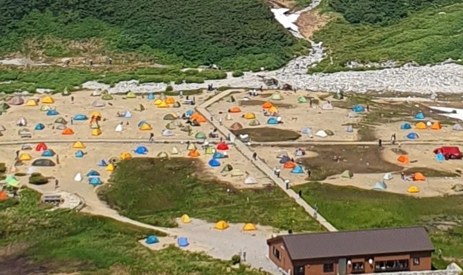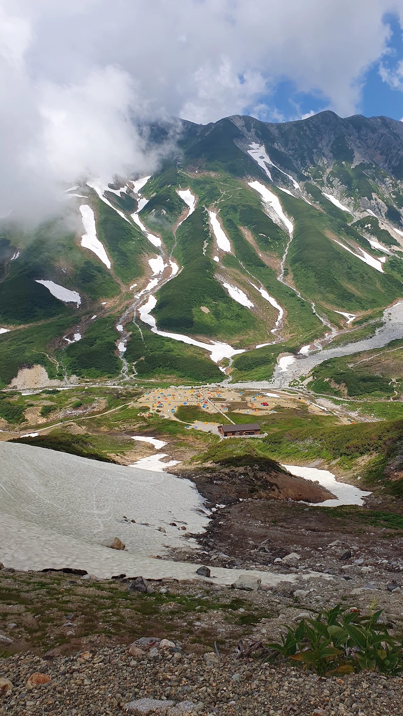 산등성이를 넘자 아래로 넓은 분지가 펼쳐졌고, 색색의 레고 조각처럼 흩뿌려진 캠핑촌이 눈에 들어왔다. 계곡은 가믈가물 멀리 보이는데 물소리가 크게 들리는게 신기했다. 그곳까지 내려가고 싶었지만 시간이 허락치 않았다.