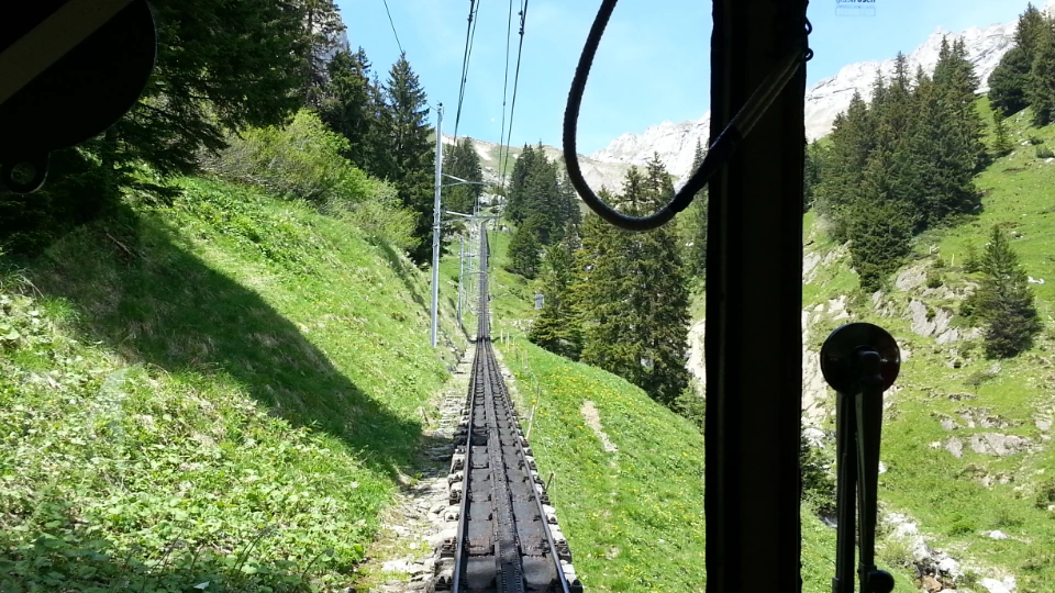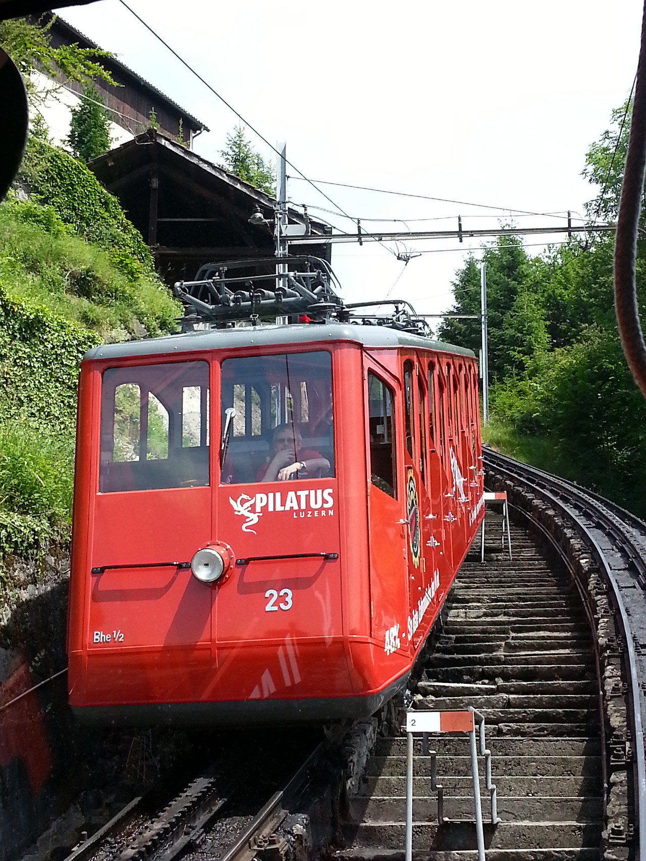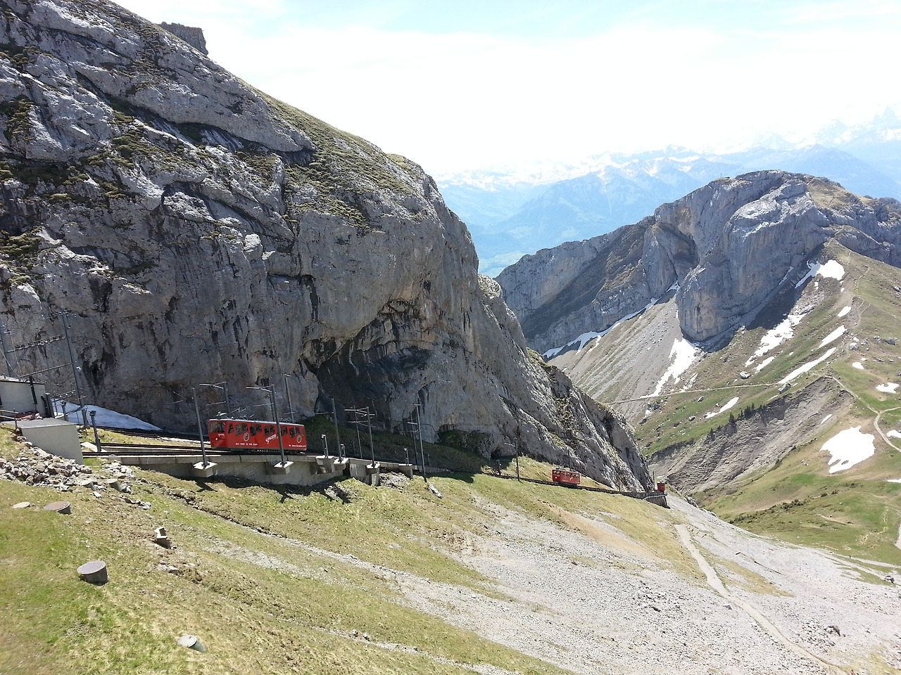 빼곡한 원시 침엽수림의 숲과 암석을 뚫어 만든 터널들을 통과하여 오르내리는 등산열차가 교차하는 중간지점에 다다르니 아래로는 아스라히 루체른 호수가 펼쳐지고 위로는 구름이 자욱해 정상은 전혀 보이질 않았다.