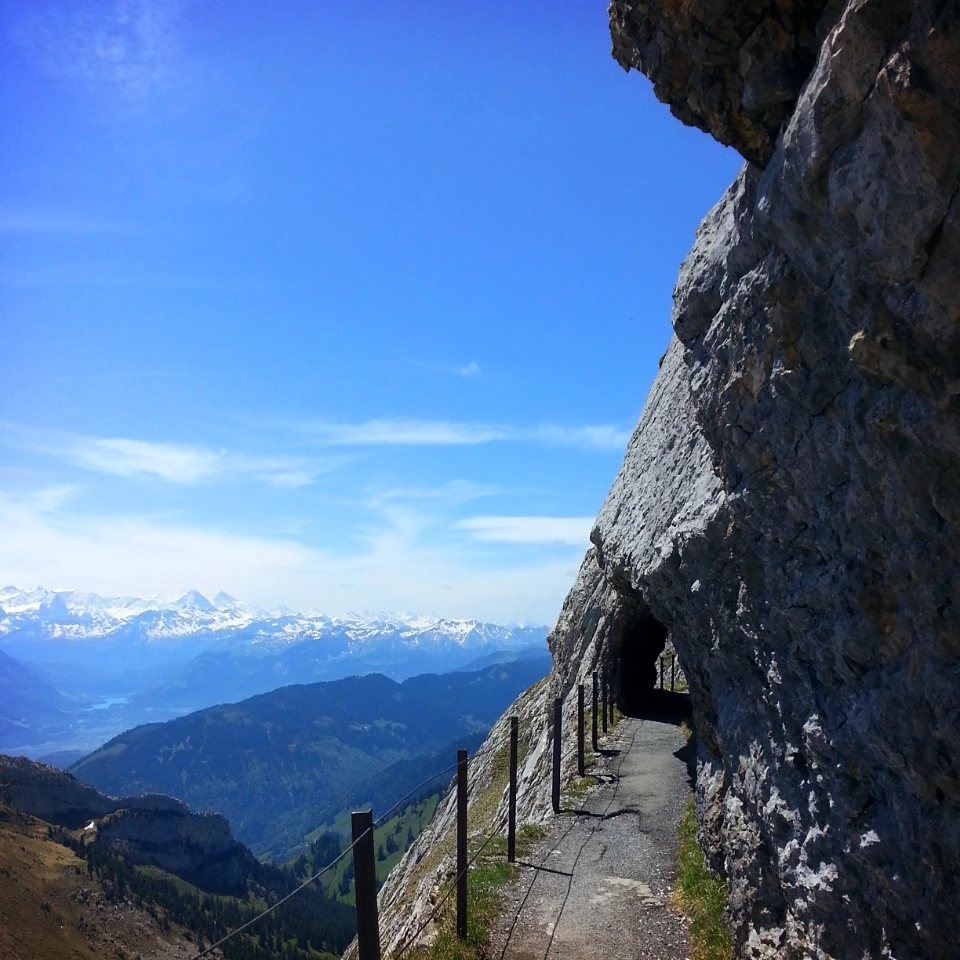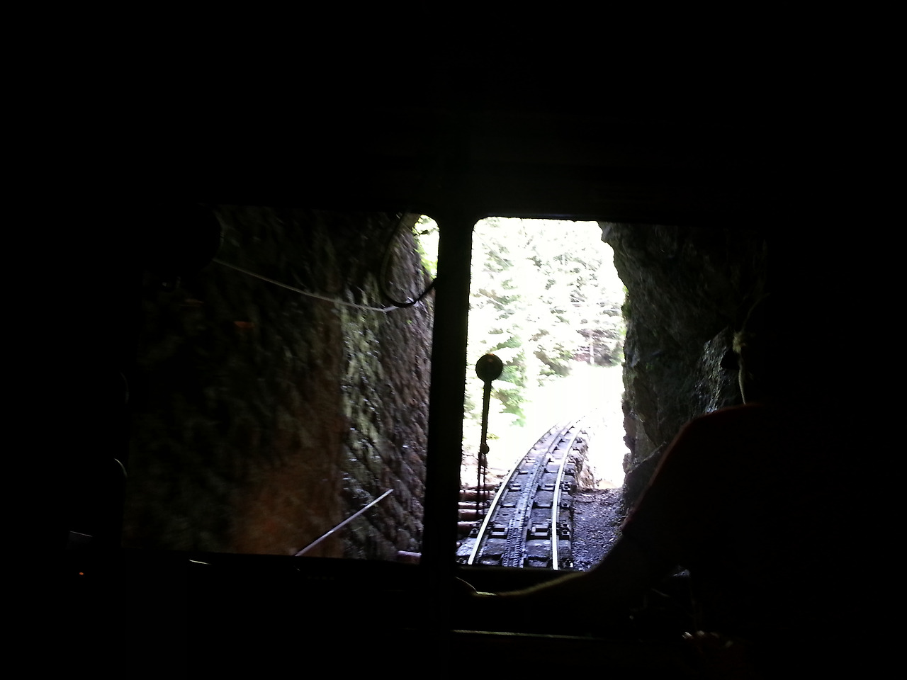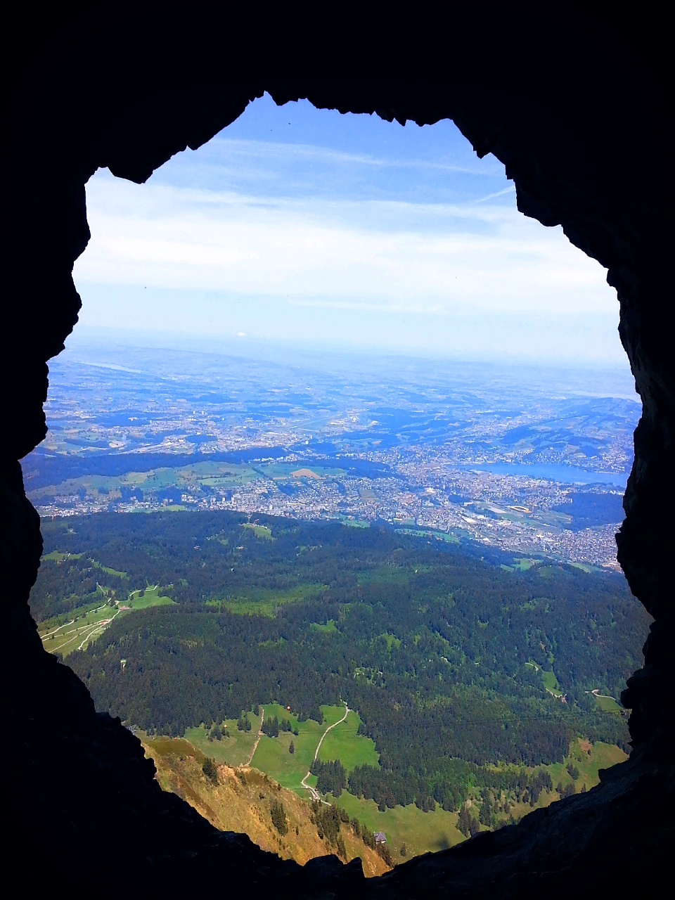빼곡한 원시 침엽수림의 숲과 암석을 뚫어 만든 터널들을 통과하여 오르내리는 등산열차가 교차하는 중간지점에 다다르니 아래로는 아스라히 루체른 호수가 펼쳐지고 위로는 구름이 자욱해 정상은 전혀 보이질 않았다.