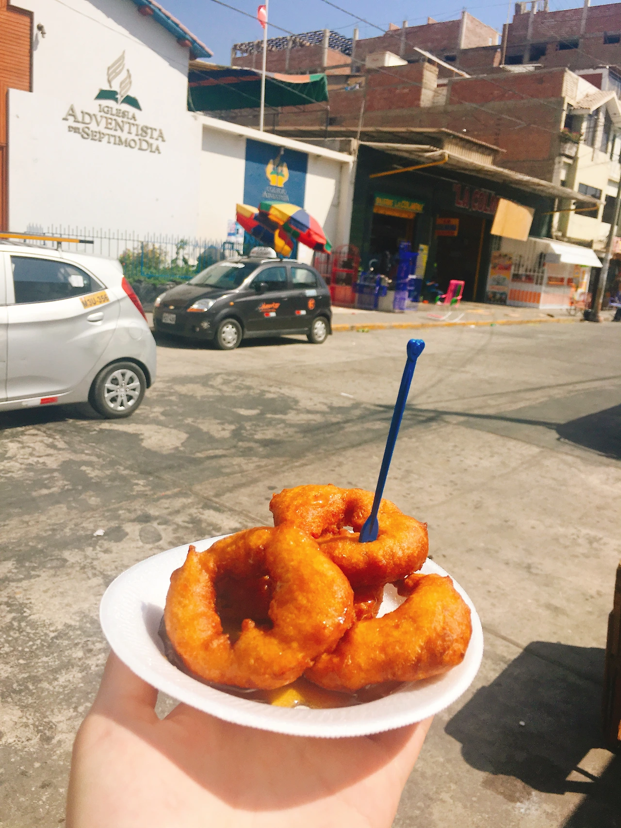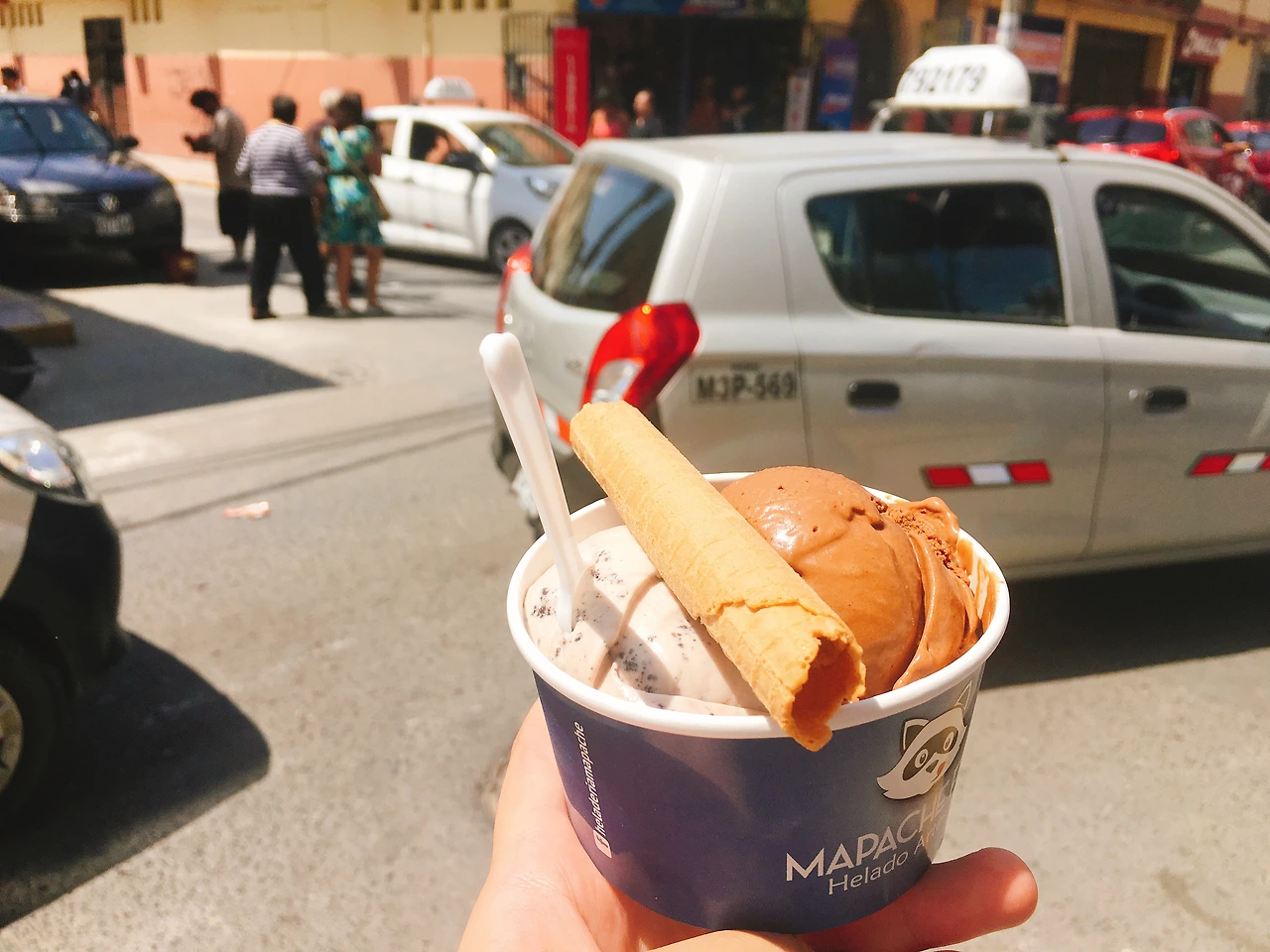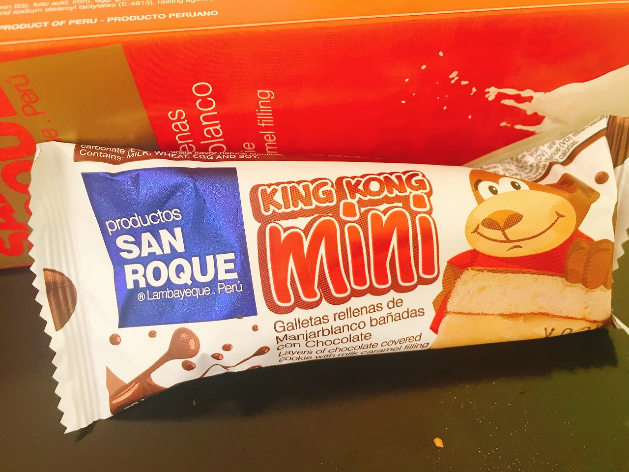 치클라요의 특산품(?)이라는 과자, 킹콩! 처음에는 작았는데 점점 크게 만들다 보니 킹콩이라는 이름을 붙였다고. 길거리에서도 많이 파는데 뭔가 비위생적인것 같아서 브랜드화되어서 점포를 낸 곳에서 구매했다. 위의 킹콩 미니는 작은 킹콩에 초콜렛이 덧씌워진 형태이다. 킹콩이란 게 어떻게 생겼냐 하면 밑의 사진을 보면 되는데 과자 사이에 꾸덕한 카라멜을 많이, 아주 많이, 너무 달아서 설탕사(死) 할 수 있을 정도로 많이 넣은 것이다. 카라멜 맛도 종류별로 다양하게 갖춰져 있는데 나는 제일 기본적인 우유맛을 샀다. 진짜로 카라멜이 너무 달고 씹기도 힘들어서 나중에는 카라멜 부분을 덜어내고 과자에 조금 붙어 있는 것만 먹었다. 페루에서 기념품을 사오라고 하면 딱 선물로 사가기 좋은 것 같은데,(심지어 진공포장 되어 있다. 상할 염려도 없음!) 두 달 동안 들고다닐 엄두가 안 나서 나만 맛보는 걸로.