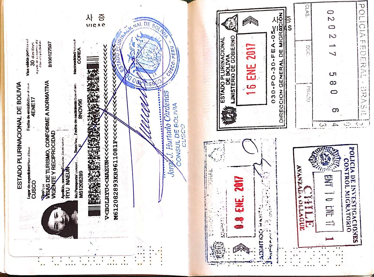 한 면을 떡하니 차지하고 있는 이것은, 볼리비아 비자다. 한국이나 다른 나라에서 받고 가려면 절차도 까다롭고 황열병을 맞아야 한다길래 일단 무작정 안 받고 페루로 떠났고, 많은 여행자들이 볼리비아 비자를 받는다는 쿠스코 볼리비아 대사관에서 비자를 받았다. 그러면 황열병 주사를 맞을 필요도 없고, 절차도 간단하며 찾아가서 여권을 내밀면 서류 확인만 하고 바로 비자를 내어 주신다. 볼리비아 쪽에 있는 아마존 지역을 갈 것이 아니고 단순히 우유니가 목적이라면 이렇게 받는 것이 더 속도 편하고 몸도 편하다.