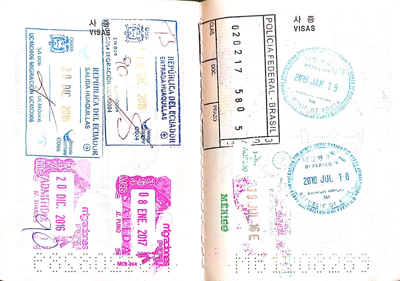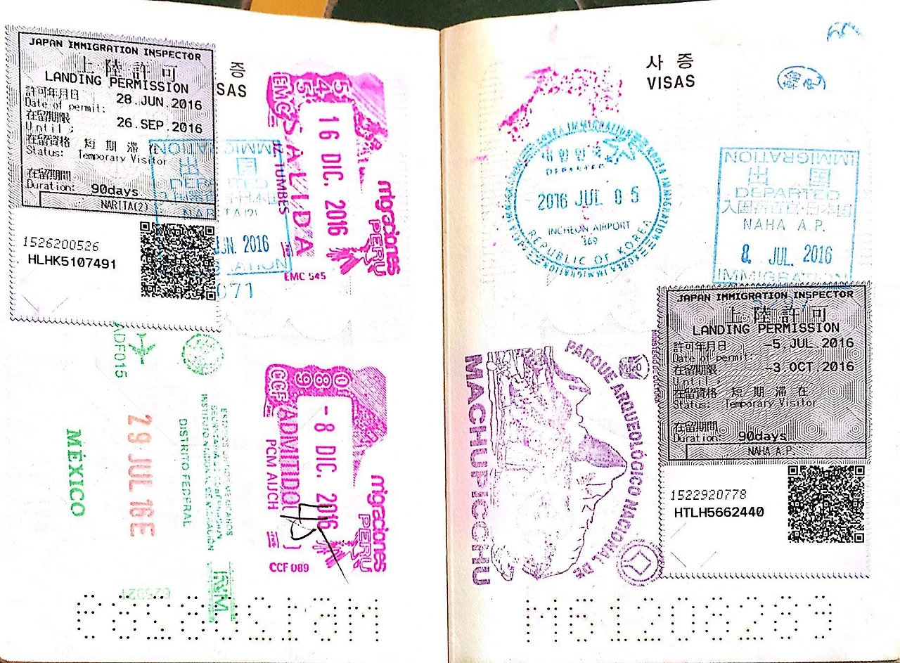 옆의 핑크색 도장 두 개는 페루의 입출국 도장. 2016년 12월 8일에 교환학생을 끝내고 항공입국해, 일주일 뒤인 12월 16일 에콰도르로 육로출국했다. 12월 말 쯤 페루 리마에서 로빈이와 만나 남미여행을 시작하기로 했는데 약 3주간 페루 북부에서만 머무르기는 심심해서, 리마와 와라즈, 트루히요 등의 도시를 거쳐 에콰도르 쿠엔카까지 올라갔다.