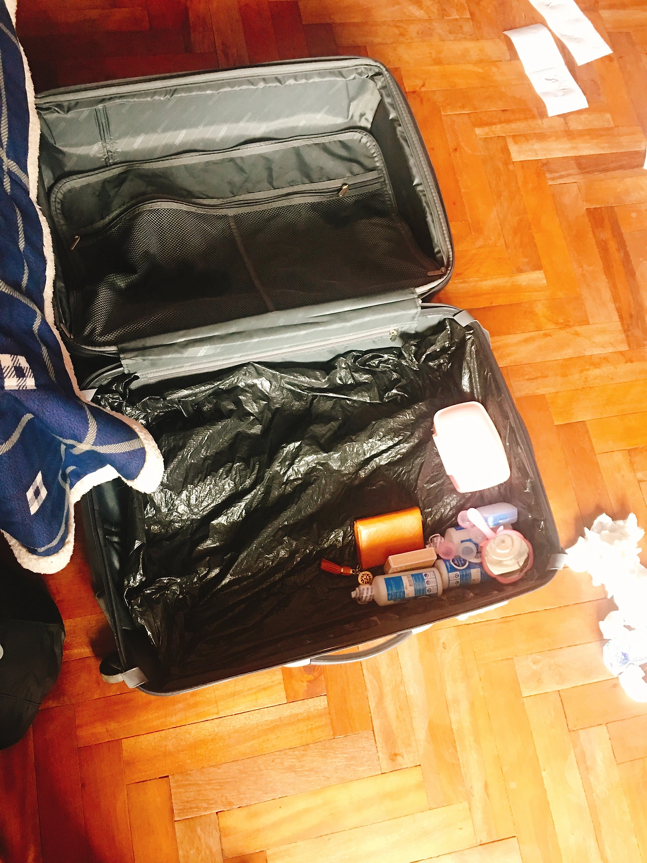 버리기 아까워서 챙겼던 수북한 노트들, 샴푸가 덕지덕지 묻은 신발과 화장품을 담아 두었던 비닐봉지들, 혹시 우산을 잃어버릴까 싶어 여분으로 가져왔었던 우산 등 샴푸 덕분에 무거웠던 짐을 4kg 가량 줄일 수 있었다. 만약에 이런 일이 없었다면 무겁게 다 짊어지고 다녔을 텐데 이 기회에 버리게 되어서 다행이라고 생각해야 하려나. 샴푸가 묻은 화장품 통이나 고데기도 물로 잘 닦아내고 나니 남은 건 캐리어에 수북이 쌓여 있는 샴푸의 잔해들이었다. 이걸로 머리를 감으면 2주는 감을 수 있을 정도의 양이었다. 처음에는 캐리어를 물로 씻어내서 말려둬야 하나 했는데 그동안 그 안에 있던 짐을 놓아둘만한 공간도 없고 캐리어가 28인치짜리라서 씻어내기도 불편했다. 일단은 물티슈와 휴지로 캐리어 안의 샴푸 덩어리들을 닦아내고 캐리어를 약간 말렸다. 그리고 호스텔에서 커다란 비닐봉지를 하나만 달라고 해서 (리셉션 : 그거 10솔(4천원)이야! /나 : 에이 공짜 공짜~ /리셉션 : 하하 퍼니 걸~ /나 : 땡큐~~) 샴푸가 묻은 쪽 캐리어 바닥에 깔았다. 움직이지 못하도록 캐리어 가장자리에 테이프로 비닐봉지를 붙이고 나니 적당히 쓸만해 보였다. 이 상태로 두 달을 들고 움직여야 한다니 약간 절망스러운 생각도 들었지만.. 지금 상태에서 할 수 있는 최선의 방법이었다.
