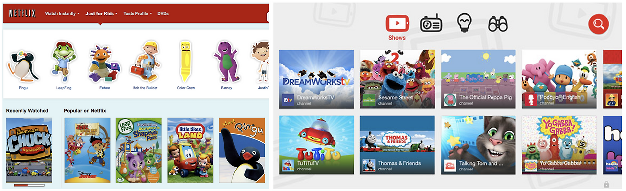 그래서인지 모바일 앱 중에는 키즈용 미디어 서비스들이 꽤 있는 편이었지만 리모컨을 사용하는 TV 서비스 중에는 완성도 높은 레퍼런스가 없었다. 넷플릭스, 유튜브에도 키즈가 있긴 했지만 단순히 흰 화면에 (까만 화면은 어른용, 흰 화면은 키즈용. 간단한 접근이다.) 타일 형식으로 어린이 콘텐츠가 모여있는 모습이었다. 그래서인지 타 부서에서도 대충 비슷한 모습을 상상하고 있었다.