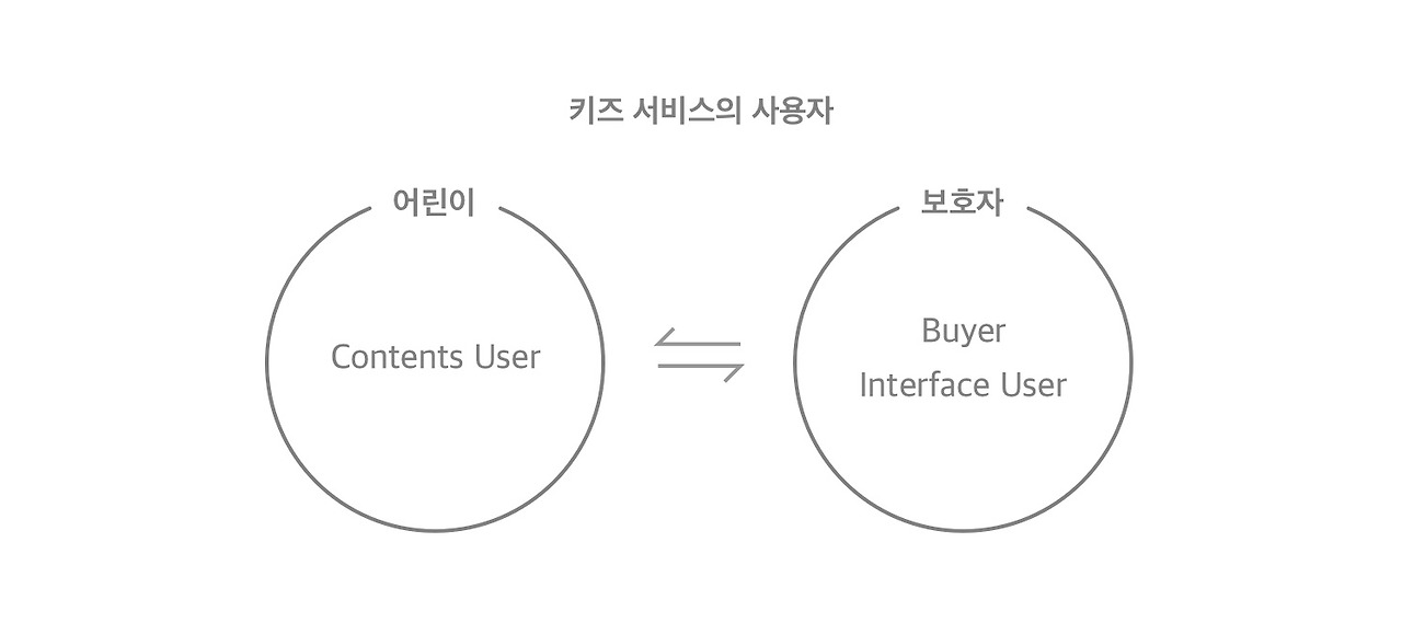 키즈 서비스라니 얼핏 어린이만을 대상으로 디자인하면 될 것처럼 보인다. 하지만 실제 서비스 사용 행태를 살펴보면 콘텐츠를 소비하는 키즈 외에도 서비스를 선택·구매(Buyer)하고, 키즈의 요청에 따라 인터페이스를 조작하는(Interface User) 보호자 타겟이 있다. 디자이너는 키즈와 보호자 두 타겟을 동시에 고려해야 한다. 특히 TV는 오브젝트(TV 화면)와 컨트롤러(리모컨)가 분리되어 있어 직관성이 떨어지기 때문에 어린이가 직접 사용하기는 어렵다. 결국 TV 인터페이스를 진짜로 사용하는 사용자는 어른일 가능성이 높다.