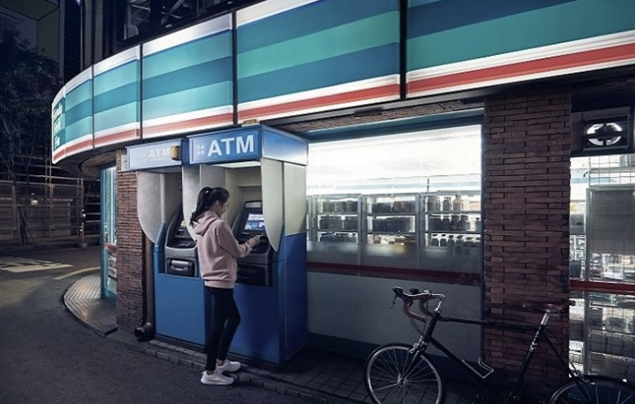 근처 편의점 바깥에 위치한 사설 ATM에 도착했다. 보통 편의점 앞에 있는 ATM은 보안을 위해 날개 모양의 플라스틱 가림막이 양쪽에 달려 있다.