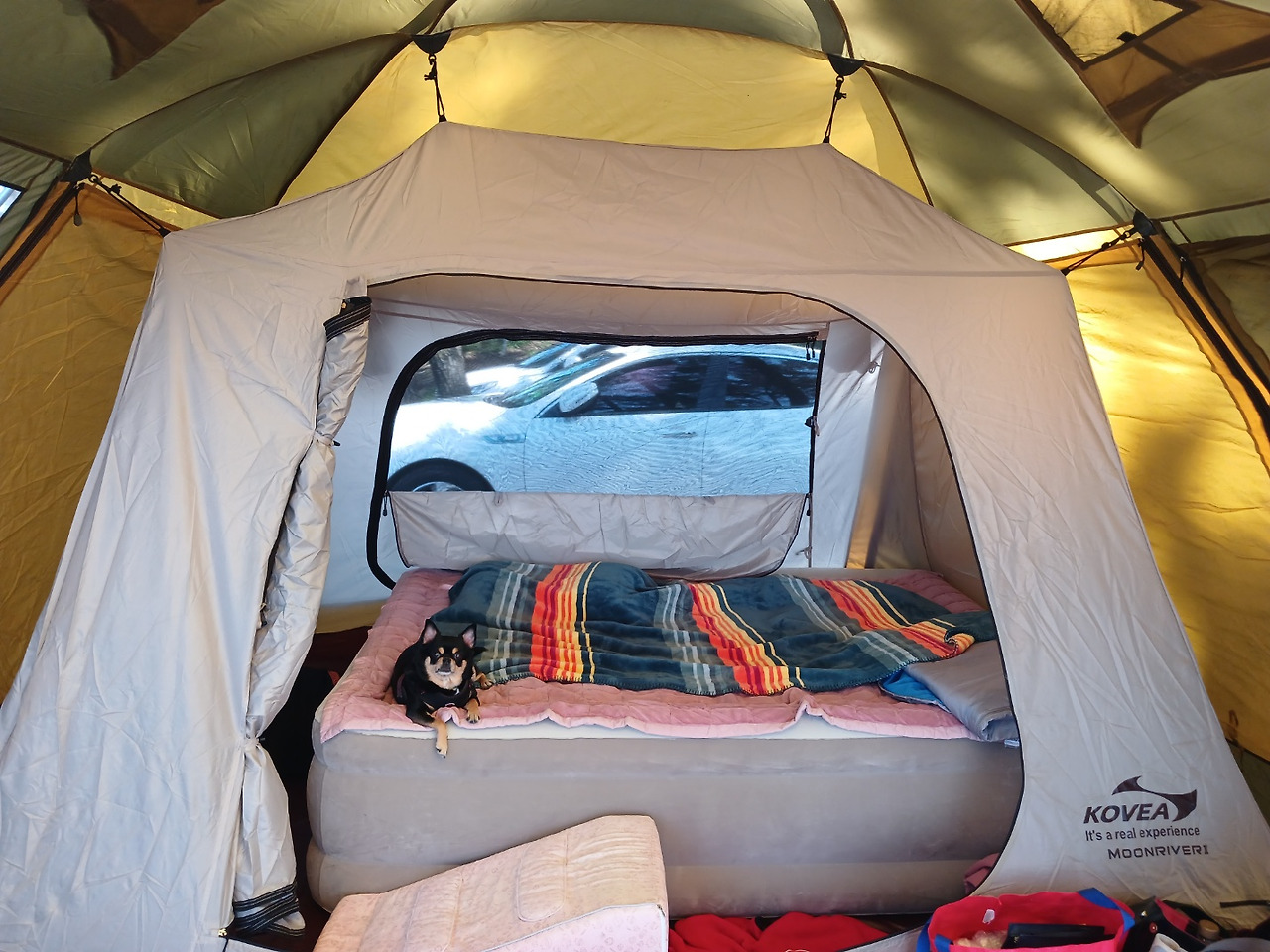 텐트를 치자마자 마치 제 방인양 쪼르르 올라가 자리를 잡는 우리 하니.