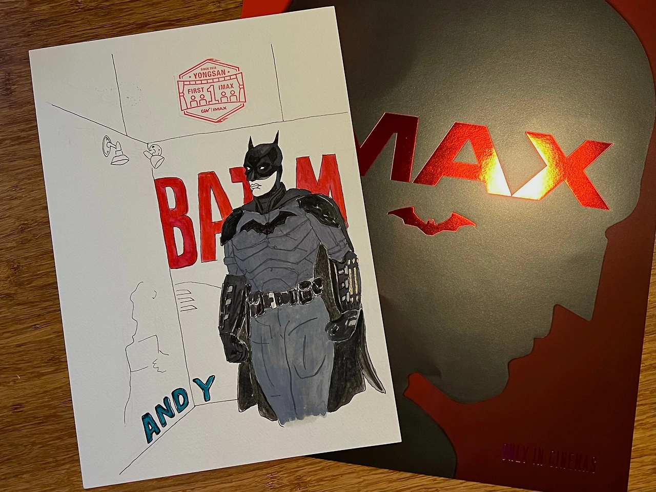 풍경이나 건물을 그릴 때는 비율이 약간 틀려도 큰 문제가 되지 않는데 인물 그림은 약간만 틀려도 너무 어색해서 그냥 둘 수가 없다. 그래서 지우고 또 지워서 배트맨의 비율을 맞췄다. 로비에 사람들이 늘어나서 채색은 집에 가서 해야겠다. 코믹스 느낌을 최대한 살리기 위해 수채 물감과 마카를 같이 사용해서 그렸다. 위쪽에 용산 CGV에서 받아온 스탬프를 붙였다.
