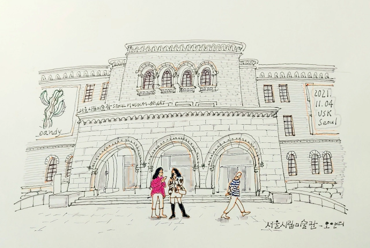 그래서 서울시립미술관은 항상 그려보고 싶었다. 먼저 주황색 볼펜으로 밑그림을 그렸다. 그리고 석조로 만들어진 파사드를 중심으로 그렸다. 나는 그림을 그리다 보면 오른쪽이 약간 올라간다. 그래서 그림이 살짝 찌그러지는데 그것은 무방하다. 아니 오히려 자연스럽다.