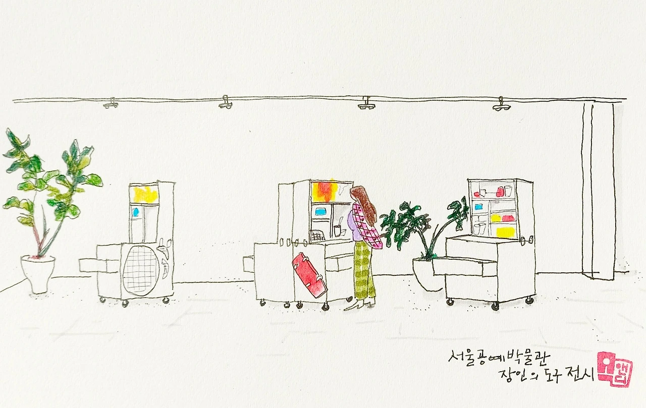 ▲ 전시1동으로 들어가면 장인의 도구가 전시되어 있다. 기획도 좋고 내용도 흥미롭다. 전시를 들여다보는 여성을 그렸다.