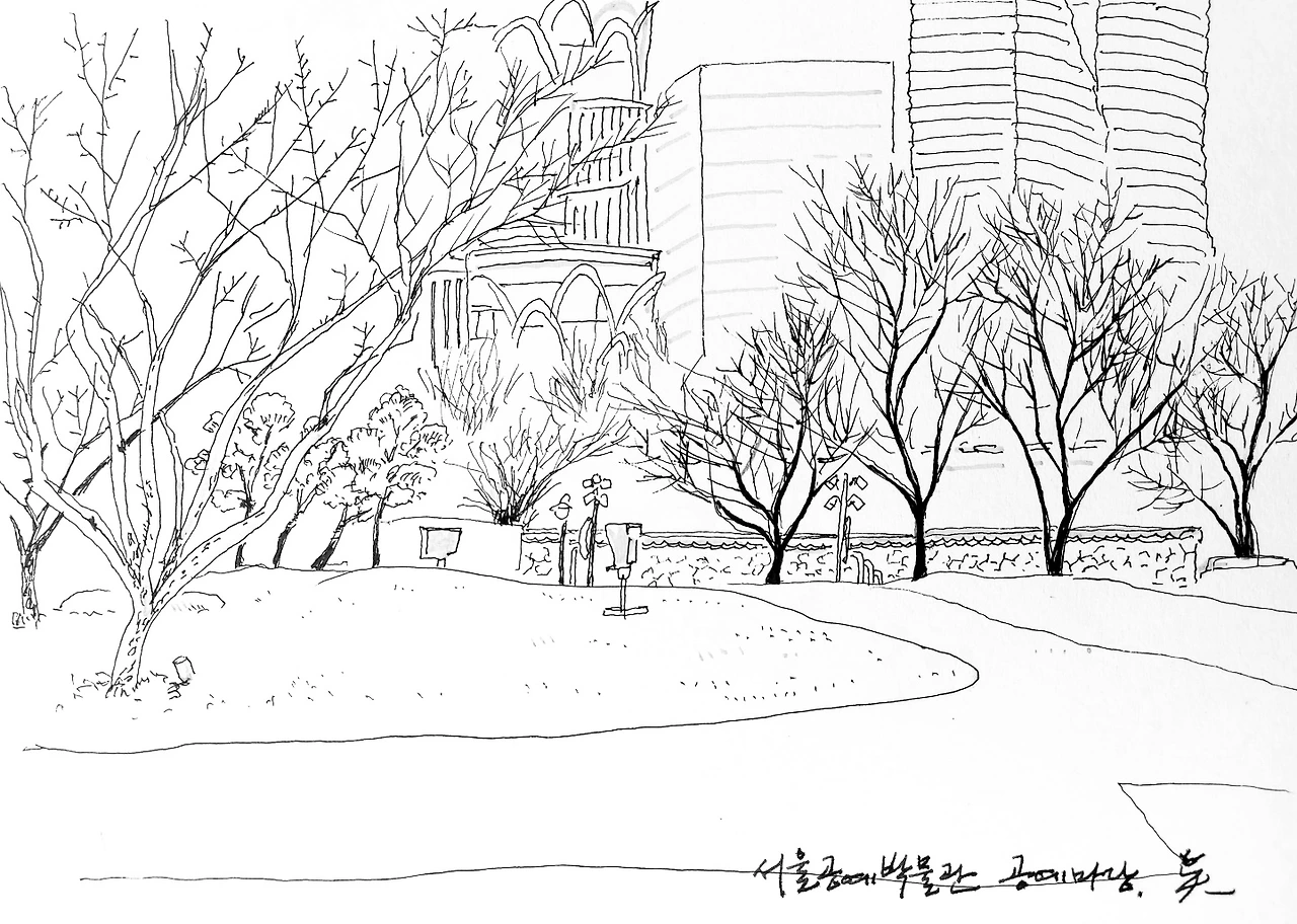 전시 3동으로 가면 자수와 보자기를 전시한다. 전시 3동 1층 로비에서 창밖을 보며 공예마당과 그 너머 건물들을 그렸다. 멀리 보이는 나무들 너머가 이건희 미술관이 들어설 송현동 부지다. 위치로 보나 컬렉션의 질로 보나 세계적인 미술관이 될 듯하다. 서울 공예 미술관은 경복궁과 국립현대미술관, 이건희 미술관과 함께 서울 도심의 문화 벨트의 한 축을 담당하게 되니, 이 자리가 과연 명당은 명당이다.
