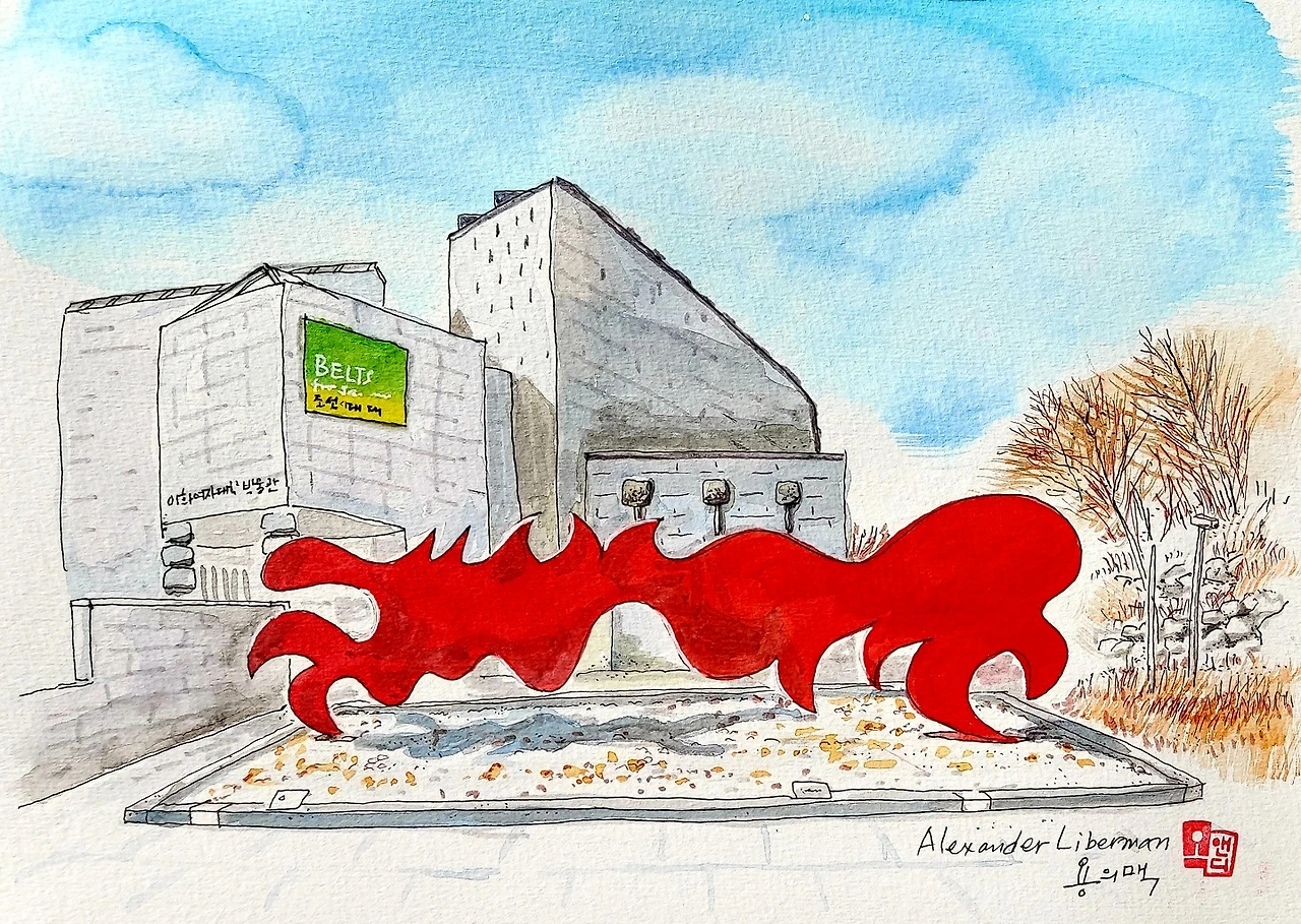 이화여대 정문에 들어서서 왼편으로 꺾어지면 이화여대 박물관이 있다. 박물관 앞의 붉은 조각이 <용의 맥>(Dragon Wall)이다. 'Dragon Wall'을 직역하면 용 벽 혹은 용 담이 되어야 하는데, 용의 맥은 지나친 의역이 아닌가 싶다. 이 작품의 작가는 알렉산더 리버만(Alexander Liberman).