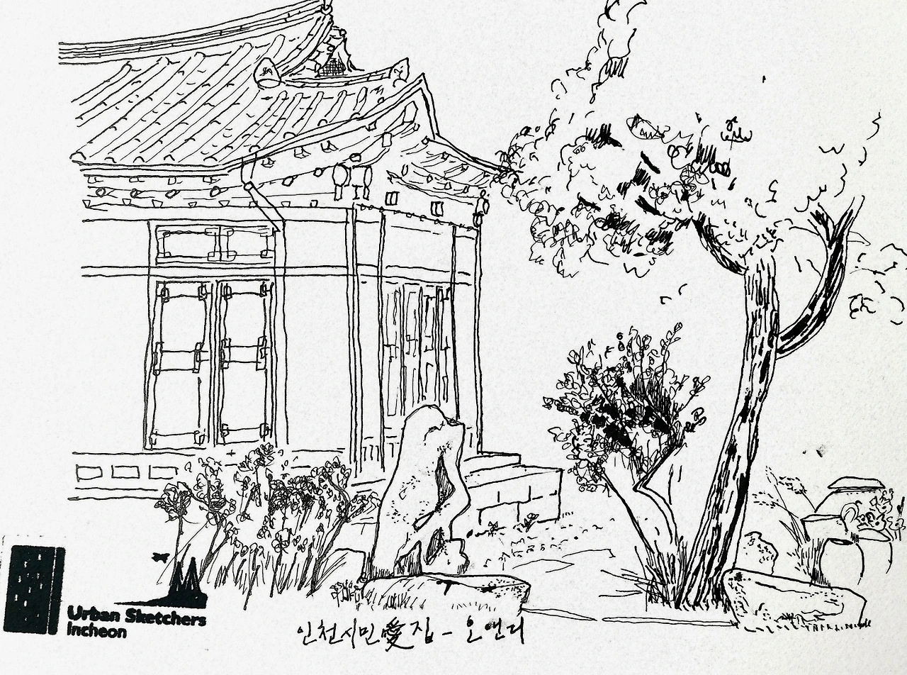 인천시민愛집은 절충식 한옥도 볼만 하지만 정원이 아름답다. 그리고 인천항이 내려다 보이는 전망이 좋다. 인천 어반스케쳐들은 제물포 구락부는 대개 한 번씩 그려봐서인지 여기 많이 와 있다. 한옥을 그리면 가장 큰 문제가 기와지붕이다. 안 그릴 수도 없고 자세히 그리자니 어렵고 시간도 많이 걸린다. 초보 스케쳐들 중에는 한옥은 아예 패스하는 경우도 많다.