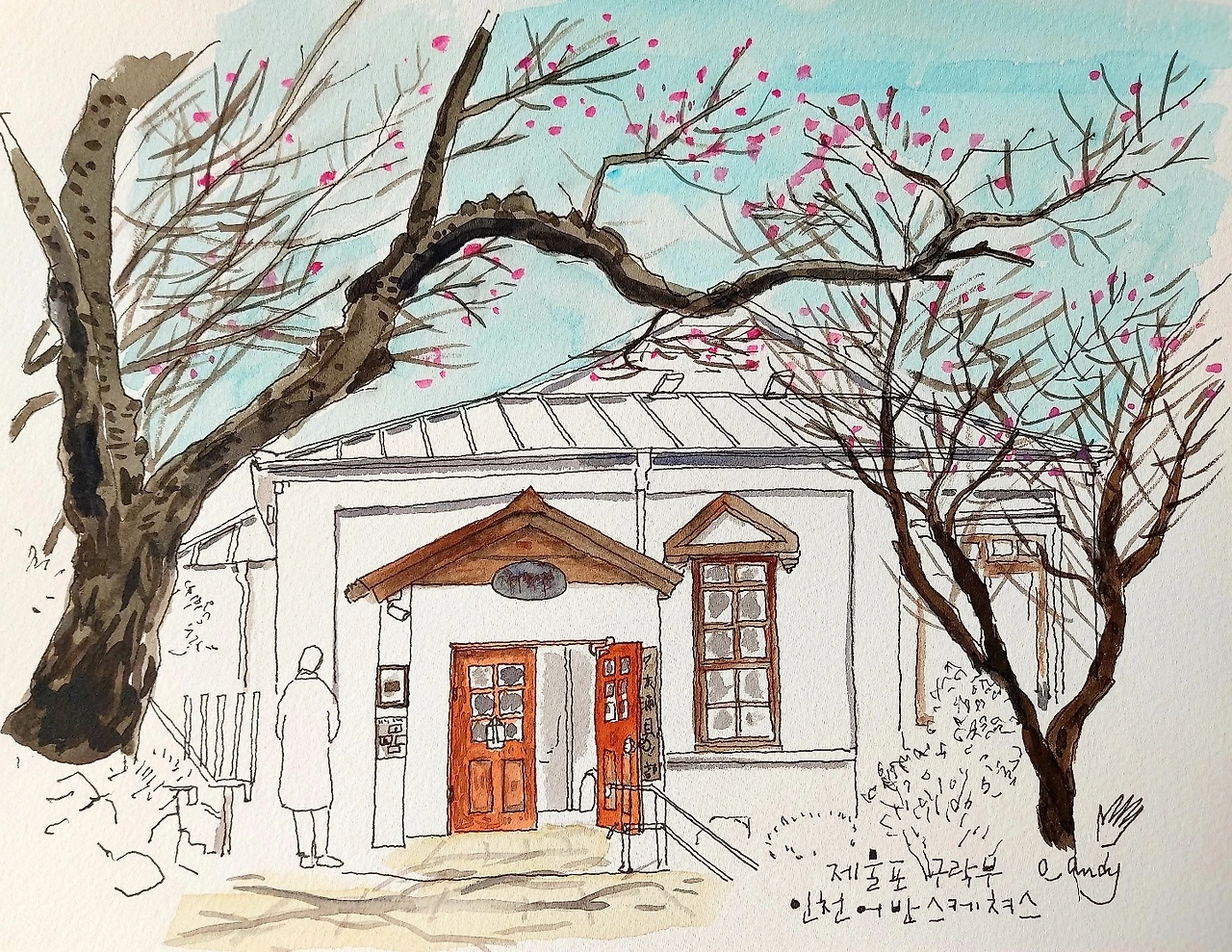 제물포 구락부 실내를 그릴까 생각도 잠깐 했지만, 건물 입구의 왕벚꽃 나무를 보는 순간 밖에서 그리기로 마음먹었다. 게다가 건물 입구는 드라마 <도깨비> 촬영 장소다. 오늘 날씨 참 좋다. 인천 스케쳐들이 하나둘 올라와서 인사를 나누고 간다.