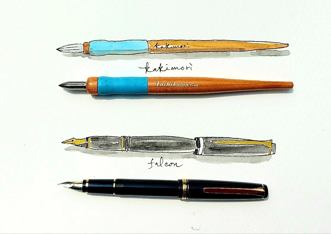 ▲ 카키모리 펜촉과 나미키 팔콘 만년필을 그려서 실물과 함께 사진을 찍었다. 카키모리 펜을 사용해서 그렸다. ⓒ 오창환