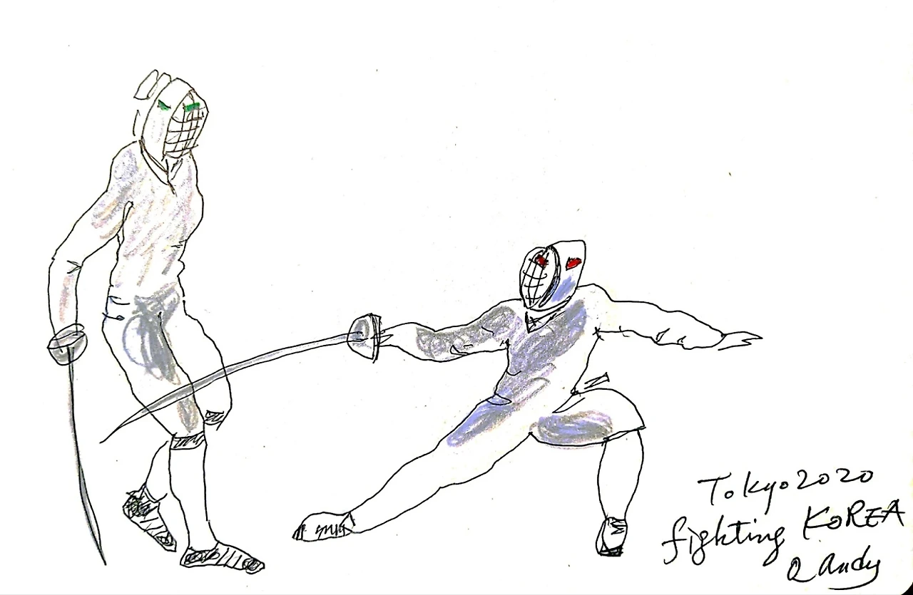 ▲ 올림픽에서 펜싱 경기를 보고 감동 받아 그린 그림. 사진을 보고 10분 만에 그렸다. 손발이나 칼이 어설퍼 보이지만 자유스러운 이런 그림이 좋다. ⓒ 오창환