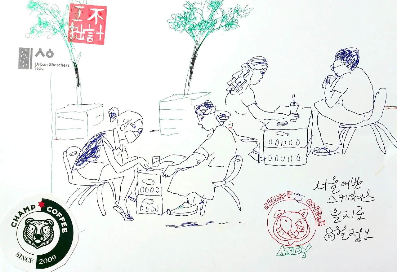 이날은 나올 때부터 최대한 서툴게 보이는 그림을 그리려고 색연필과 볼펜을 갖고 나왔다. 종이도 그에 맞게 준비했다. 수채화 용지는 요철이 있어서 색연필이 잘 안 나가고 색을 칠했을 때 오목한 부분에 색이 잘 안 먹는다.
