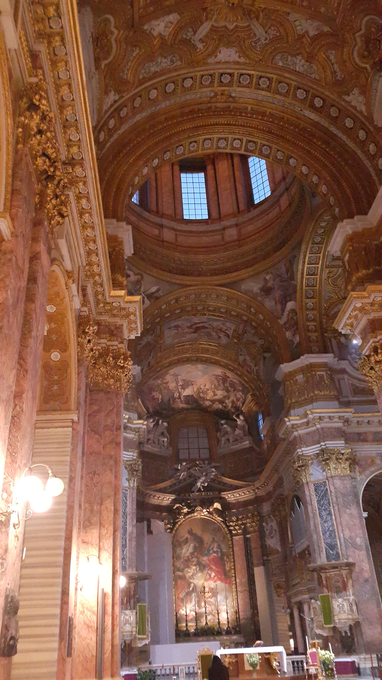 스페인 광장의 계단을 내려와 들어 선 골목길은 말 그대로 오고 가는 사람들로 인해 한치 발걸음을 옮기기가 힘들었는데 옹기종기 모여있는 명품 상점 앞에는 한국인과 중국인들로 보이는 동양인 그룹들이 손에 번호표를 하나씩 받아 들고는 자기 차례의 입장을 기다리고 있었다. 한시바삐 혼잡한 이 거리에서 벗어나고 싶은 생각이 들었다. 발걸음을 재촉하다 인근의 성당에 잠시 들러 장의자에 앉아 높은 천정의 벽화들을 살폈다.