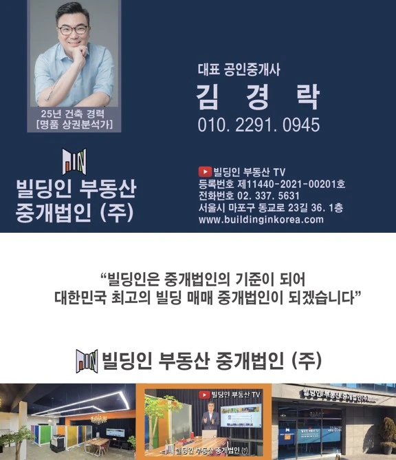 25년 건축 경력의 [명품 상권분석가] 대표 공인중개사 김경락 010 2291 0945 유튜브 : 빌딩인 부동산 TV www.buildinginkorea.com