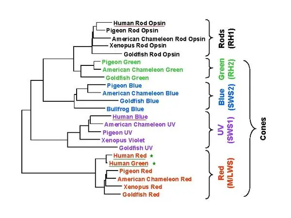 이걸 쉽게 설명하자면 단세포하나로 진화를 하던 생명체가 빛을 인식하게 되고 오랜 기간(여기서 오랜 기간은 몇 백 년 정도가 아니 몇십억 년 그러니까 아~~~~~~~~주 오랜) 색을 인지할 수 있는 옵신이란 단백질이 그들의 눈에서 하나 하나 만들어져서 어류, 조류, 파충류 등으로 진화하며 결국엔 빨강, 초록, 파랑을 모두 다 보게 된 거야. 그리고 그 색을 본다는 것이 좀 더 많은 먹잇감을 볼 수 있는 이유로 더 많이 살아 남았고 더 빨리 진화하게 된 거였어. 생존뿐만 생식에 대해서도 색은 엄청난 효과를 발휘했어. 좀 더 화려하고 좀 더 선명한 수컷들에게만 암컷들이 관심을 가지고 선택적인 섹스를 해주다 보니 수컷들은 더 더 화려하게 변해간 거야. 그래서 어류, 조류, 파충류들은 그들의 눈에 보이는 색을 모두 이용해서 계속 화려해지고 있는 거지. 그런데 포유류는? 포유류 즉 우리의 직계 조상은 쥐 같은 작은 개체였어. 감히 낮에는 돌아다닐 생각도 못하는 쥐 같은 포유류는 오랜 세월 빛을 못 보고 밤에만 나와서 생활하다 보니 빨간색을 볼 필요가 없었고 필요 없는 것은 계속 버리는 진화의 원리로 결국 파랑과 녹색으로만 세상을 보게 된 거야. 그래서 지금 개나 말 같은 포유류가 보는 세상은 우리와 달라. 이렇게 말이지.