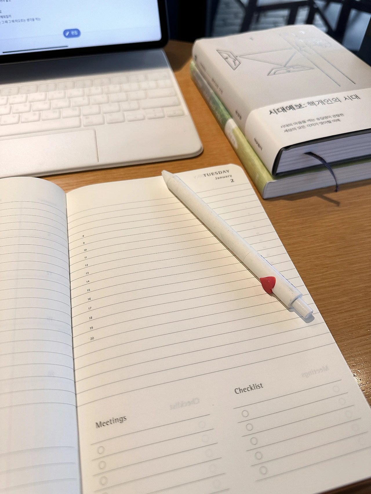 다이어리를 다시 쓰기로 하면서 정한 2024년의 목표. 읽고 느끼며 쓰는 사람이 되는 것이다. 거창한 목표를 보고 하루하루 성장하며 더 나은 내가 되기를 바라기보다, 더 많이 읽고 더 깊이 느끼며 꾸준히 써나가는 일상을 누려보자. 앞으로 어떤 이야기들이 남겨질지 기대가 되지 않는가.