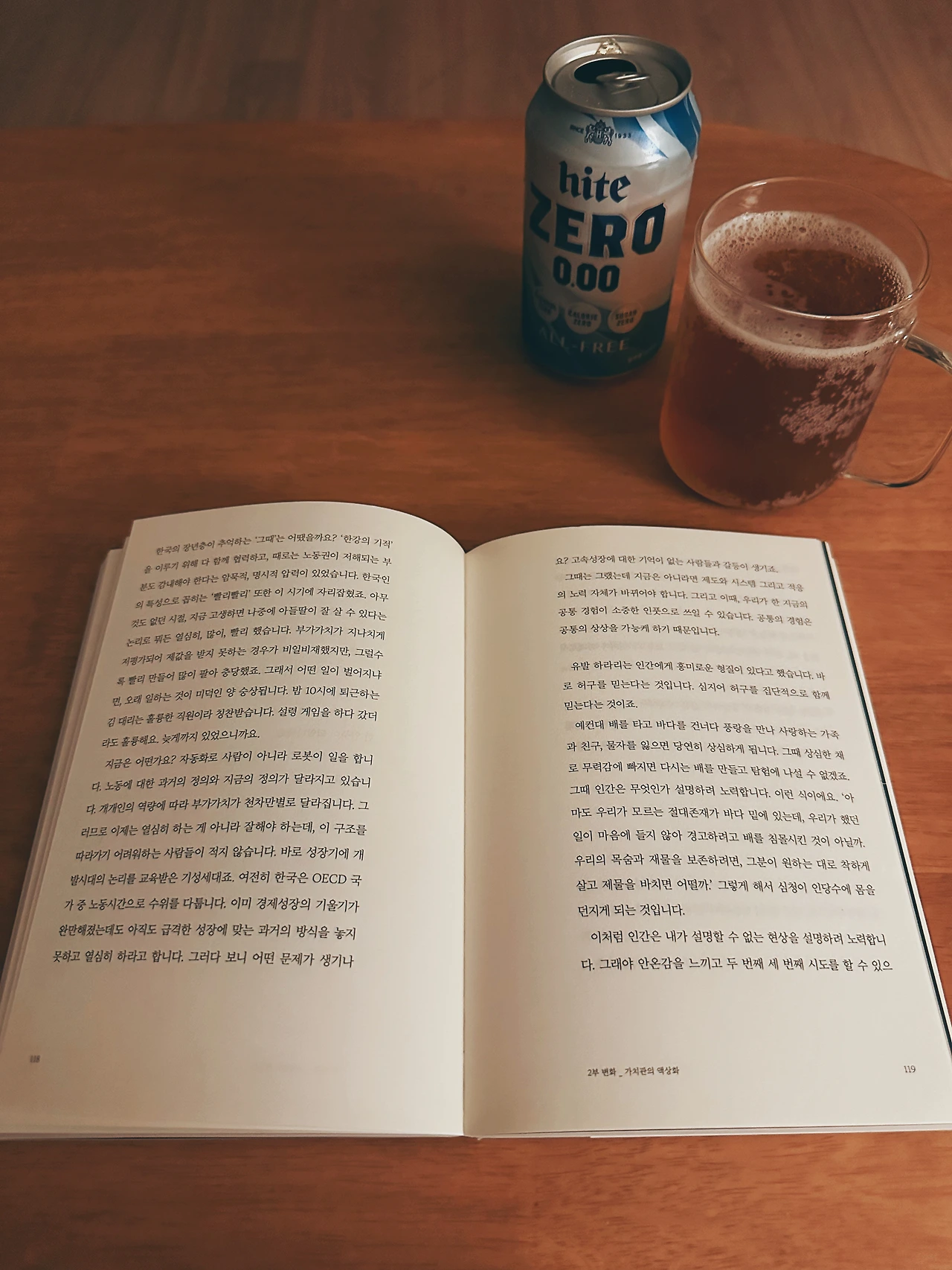 모두가 잠이든 고요한 시간. 내일은 늦잠을 잘 수 있는 토요일. 김치 냉장고 깊숙한 곳에서 시원하게 몸을 담그고 있던 무알콜 맥주를 꺼내어 거실 탁자에 놓는다. 조용히 집중해서 읽어야 할 책과 함께 자리에 앉는다.