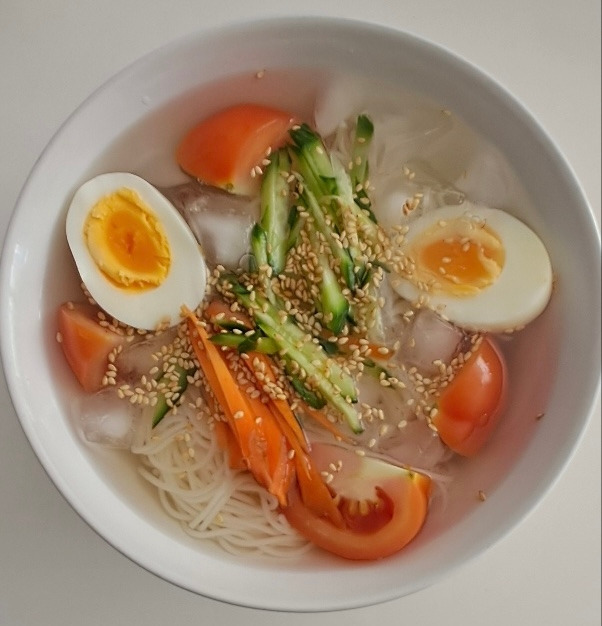소면을 삶고, 육수에다 당근, 오이, 토마토, 삶은 달걀을 얹은 다음 얼음을 가득 담고, 끝으로 참기름 한 방울, 참깨로 마무리.