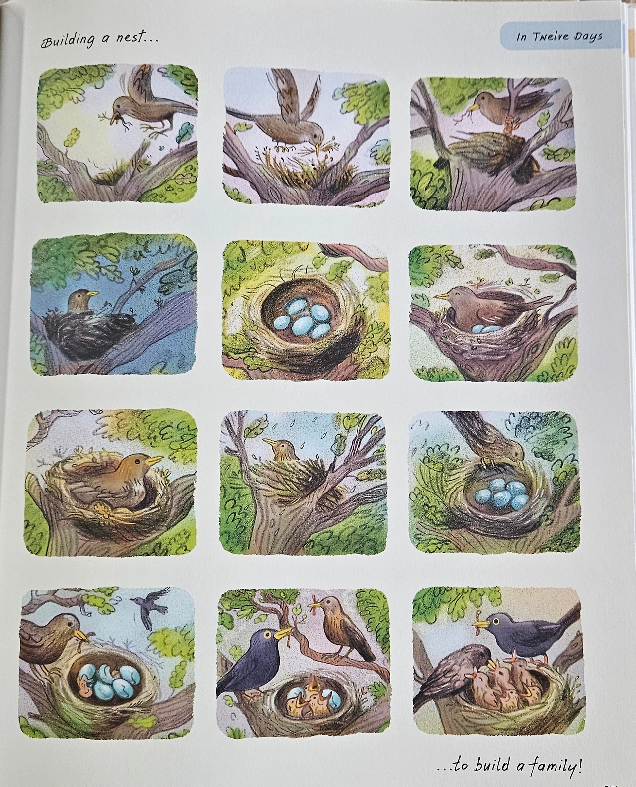 아침이 되면 아빠 검은지빠귀가 둥지로 돌아와 짝에게 줄 먹이인 작은 씨앗 몇 알과 육즙이 많은 지렁이를 가져다줍니다.
