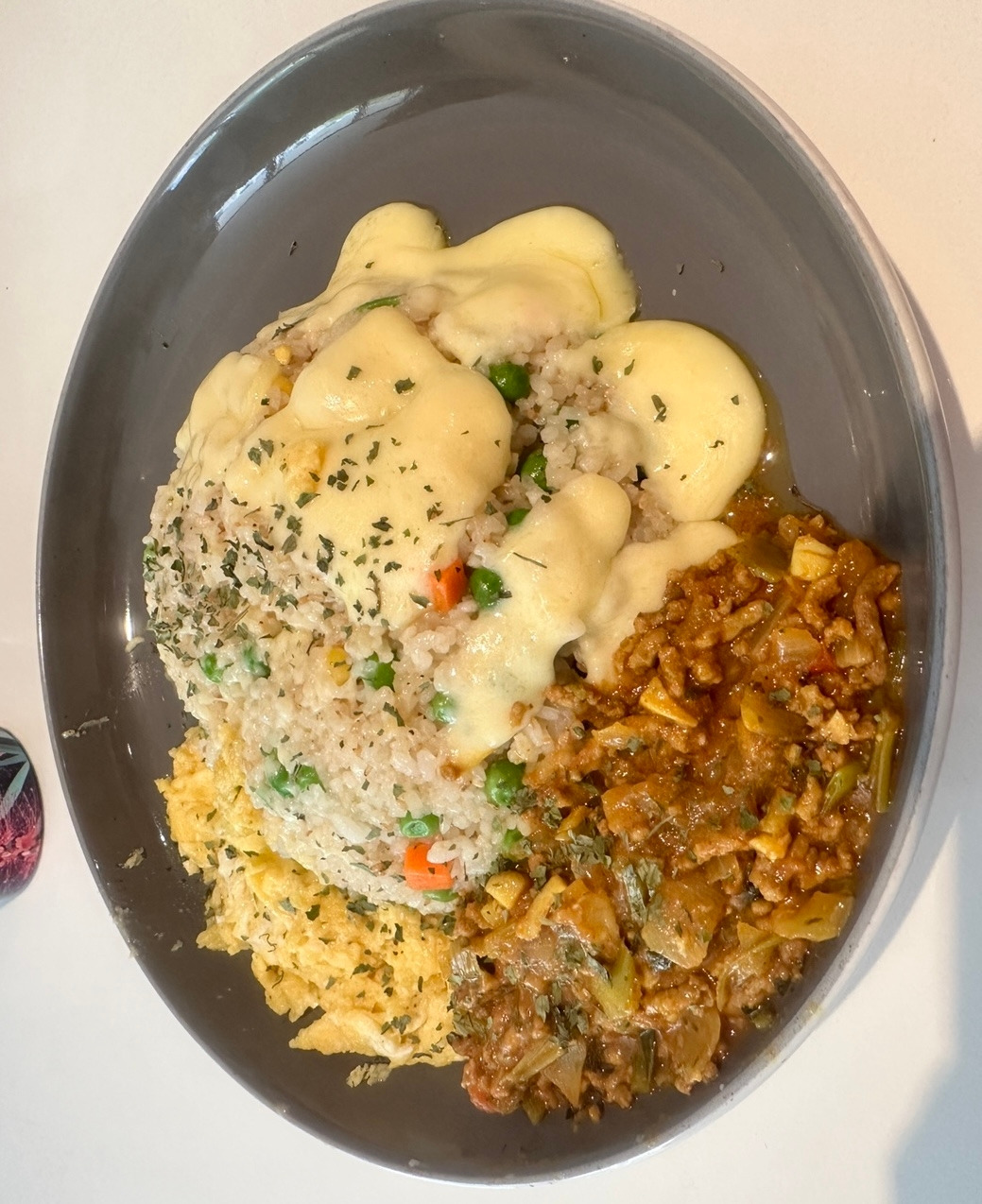 (카레를 볶음밥이 담기 접시 한쪽에 담는다)