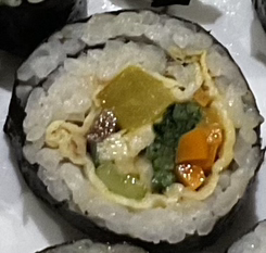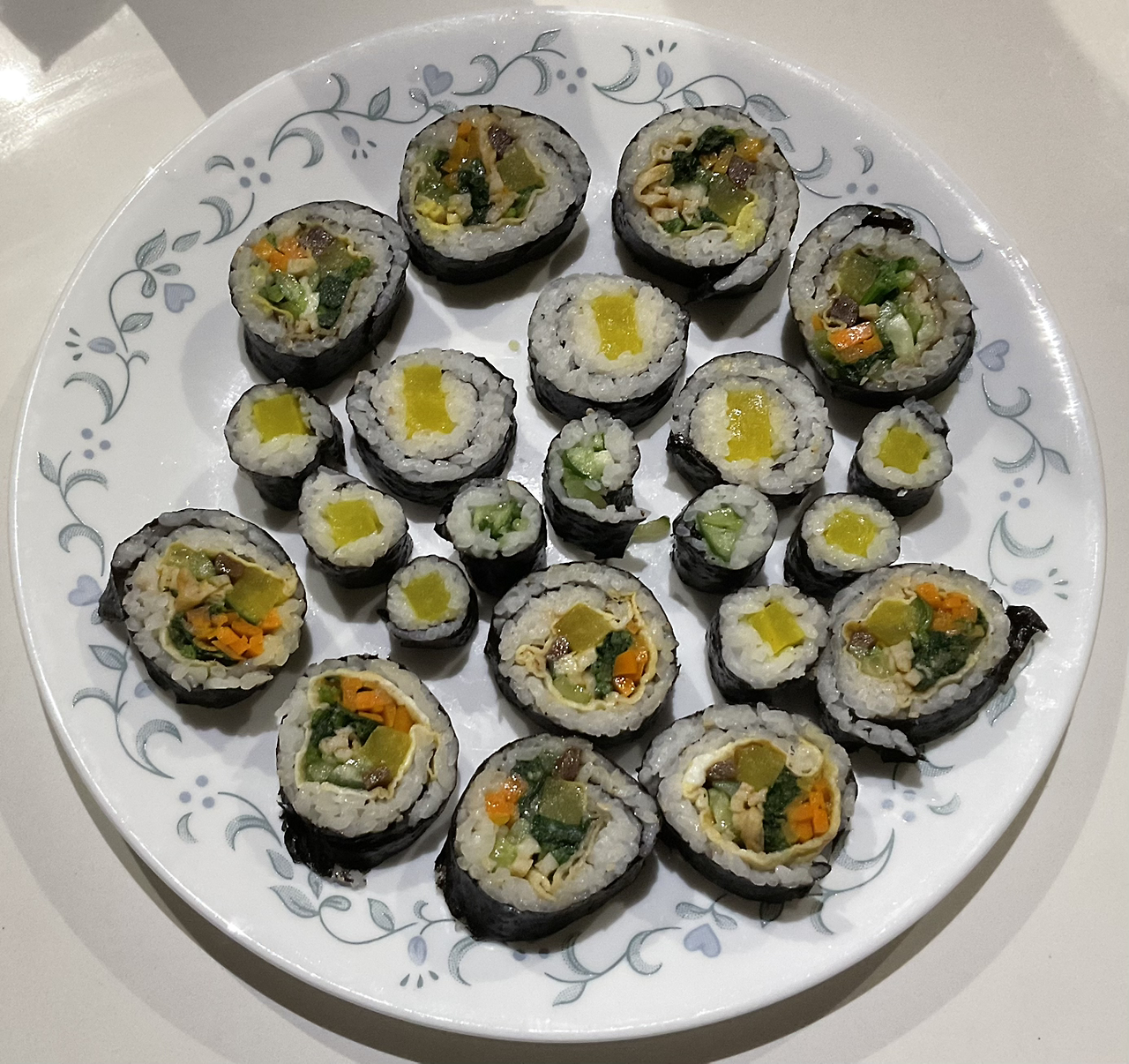 - (특별한 부탁을 한 친구의 청이 있기도 해서) 김 한 장을 반으로 잘라 오이, 노란 무, 당근 등의 독무대로 만들어도 좋다.