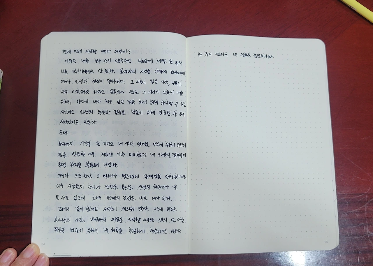 하다 보니 많은 글귀들을 계속해서 적어 내려갔다. 꽃이 지고 아무도 보지 않을 때 열매가 맺힌다 라는 저자의 말처럼 혼자만의 시간을 견뎌내고 오롯이 나를 위해 집중할 시간이 지금의 내게 주어진 것 같다.