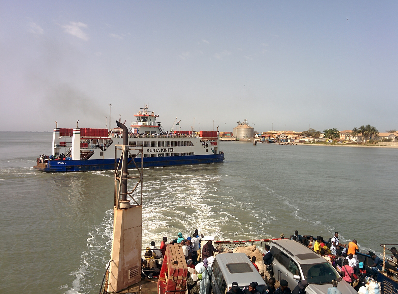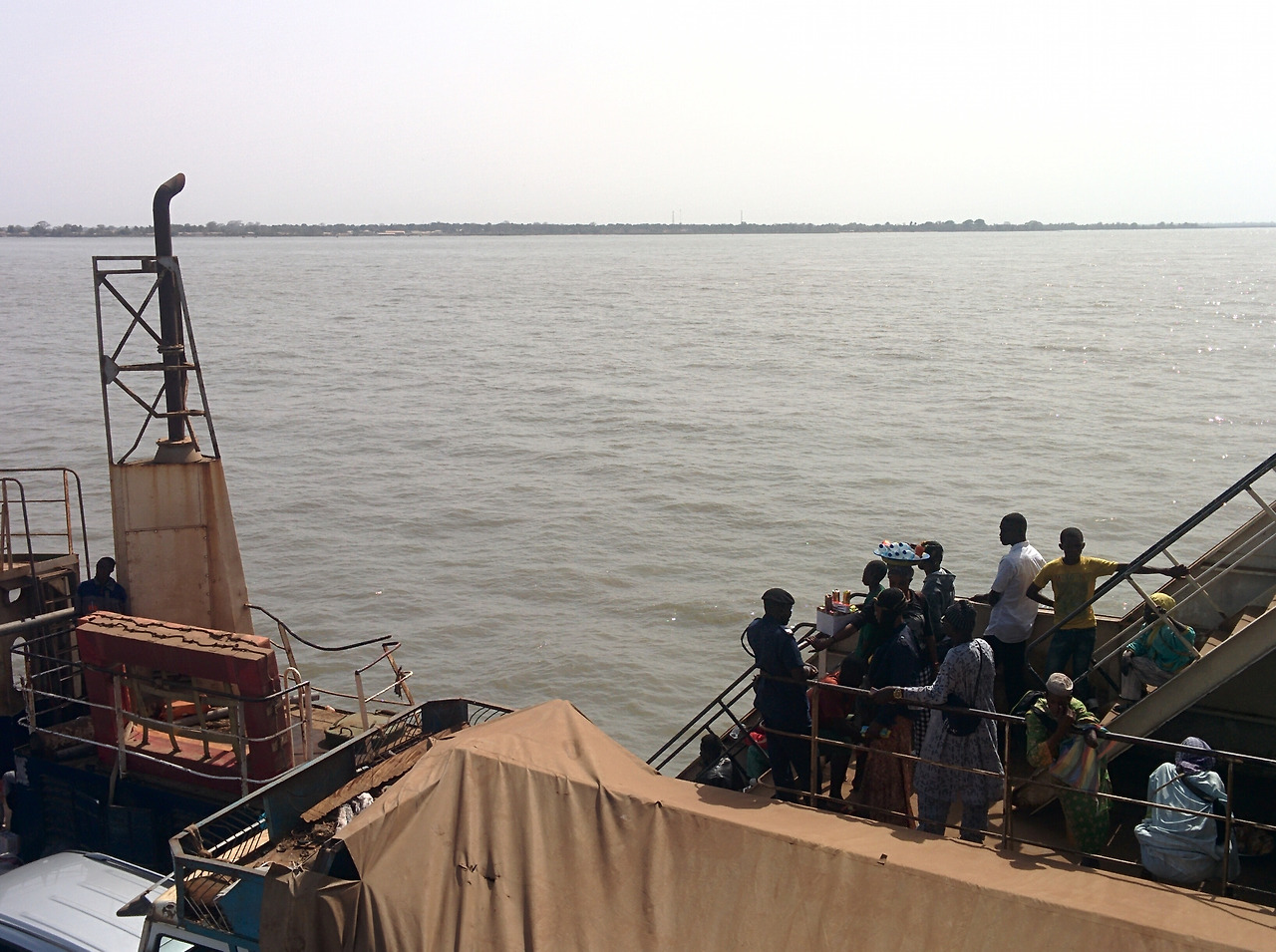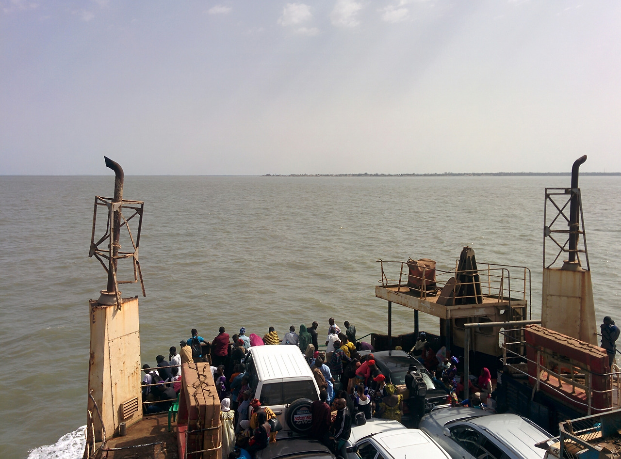 30분 정도 기다렸을까 승객을 가득 실은 연락선이 나타나 느릿느릿 부두로 접안하기 시작했다. 배에서 승객들과 차가 다 빠져나가고 나서야 드디어 게이트가 열렸다. 나는 아까부터 제법 많은 사람들이 굳이 따가운 햇볕이 드는 게이트 앞에 딱 붙어서 기다리고 있는 이유가 궁금했는데, 게이트가 열리자마자 그 사람들이 재빠른 걸음으로 배에 올라앉을만한 자리를 전부 차지해버리는 것으로 의문이 풀렸다. 느지막이 사람들을 뒤따르던 나는 갑판 위의 사람들과 짐 보따리들을 요리조리 피해 구석으로 가서 난간에 몸을 기댔다. 수상 수송 말고는 감비아 강의 북안과 남안을 오가는 방법이 없다 보니 ‘과적이 아닐까?’ 하는 생각이 들 정도로 탑승객이 많았다.