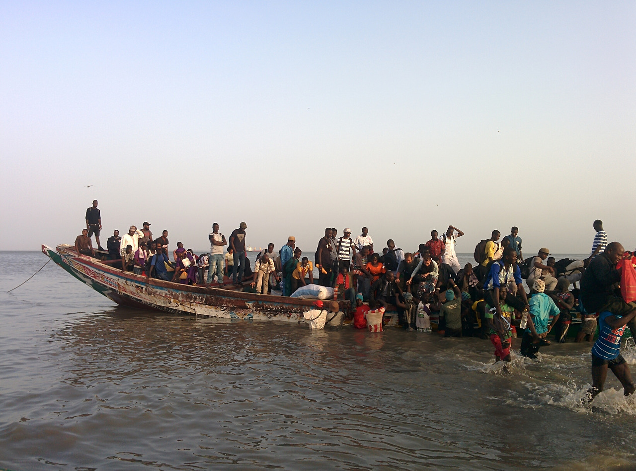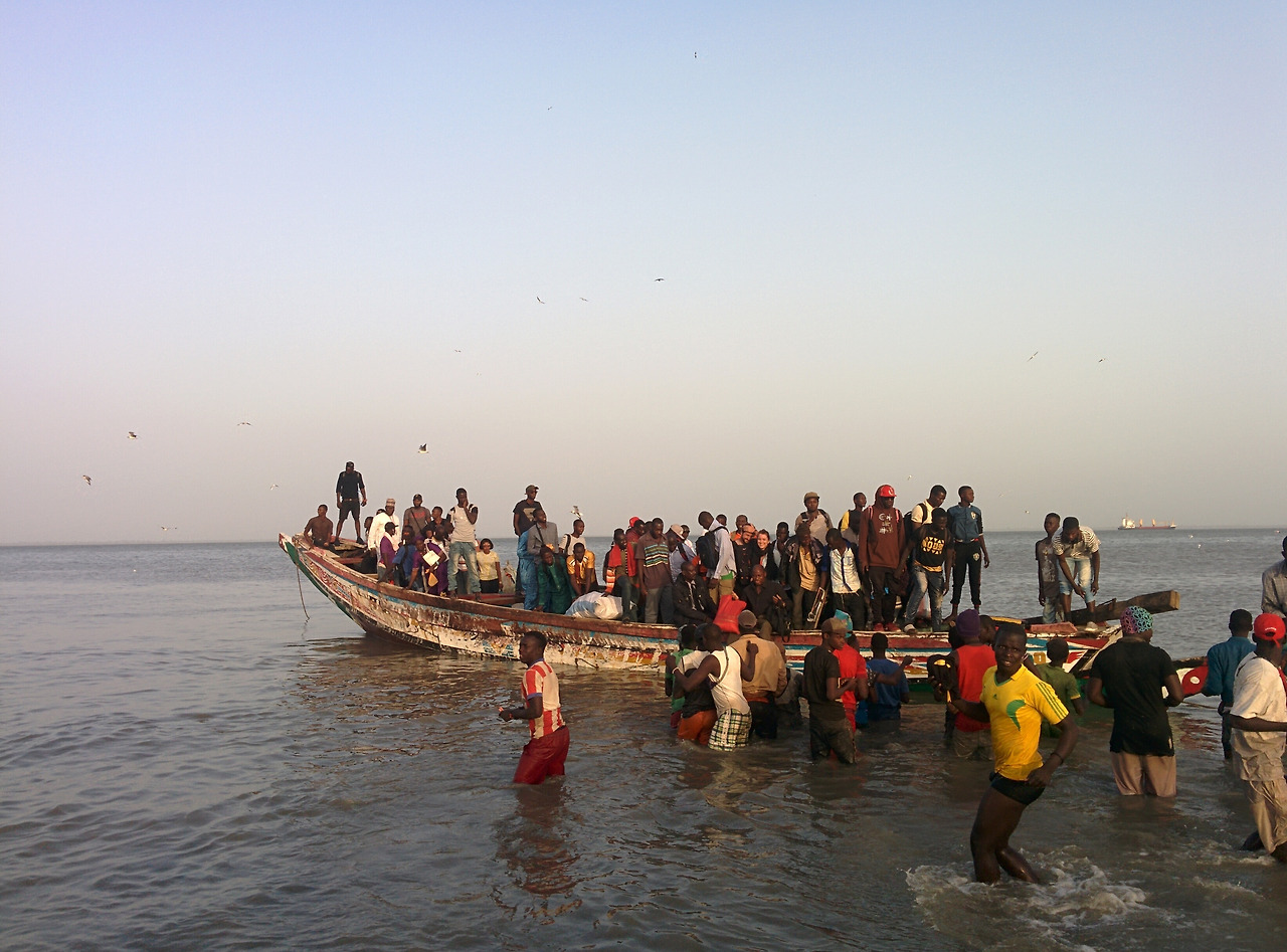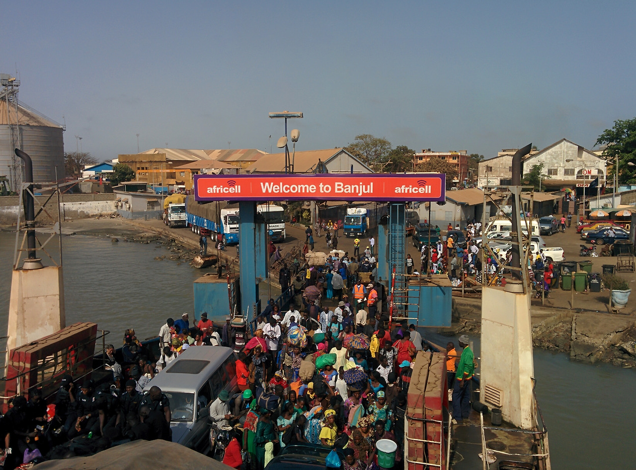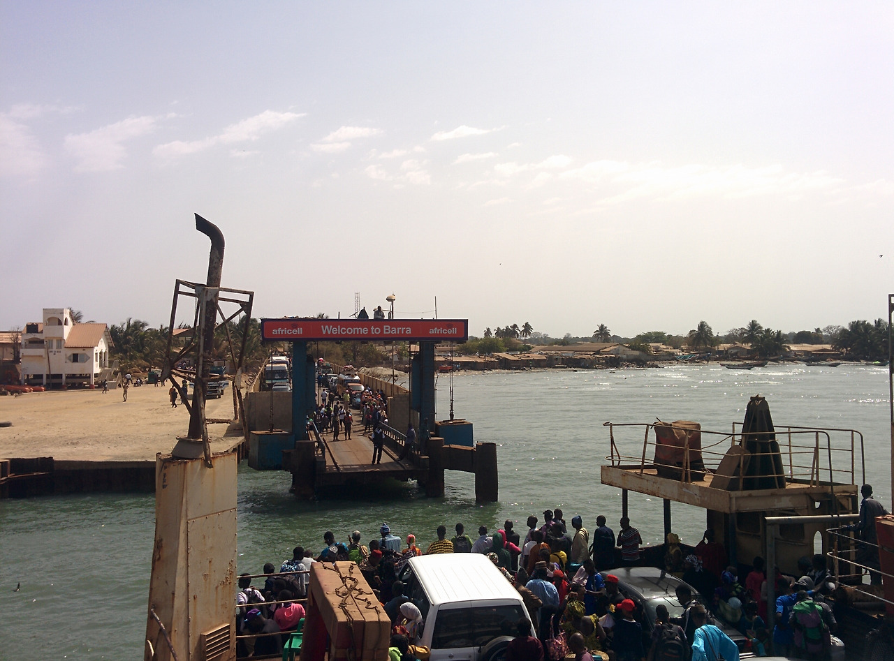 30분 정도 기다렸을까 승객을 가득 실은 연락선이 나타나 느릿느릿 부두로 접안하기 시작했다. 배에서 승객들과 차가 다 빠져나가고 나서야 드디어 게이트가 열렸다. 나는 아까부터 제법 많은 사람들이 굳이 따가운 햇볕이 드는 게이트 앞에 딱 붙어서 기다리고 있는 이유가 궁금했는데, 게이트가 열리자마자 그 사람들이 재빠른 걸음으로 배에 올라앉을만한 자리를 전부 차지해버리는 것으로 의문이 풀렸다. 느지막이 사람들을 뒤따르던 나는 갑판 위의 사람들과 짐 보따리들을 요리조리 피해 구석으로 가서 난간에 몸을 기댔다. 수상 수송 말고는 감비아 강의 북안과 남안을 오가는 방법이 없다 보니 ‘과적이 아닐까?’ 하는 생각이 들 정도로 탑승객이 많았다.