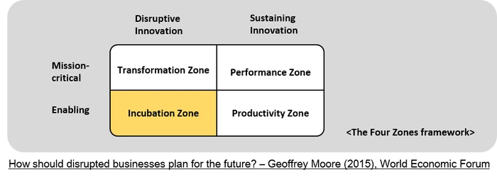 이 중 Incubation Zone은 부상 중인 새로운 기술 카테고리를 포함하며 보다 빠른 성장을 주도하여 향후 상업적 시장 가치를 획득하는 데에 목적이 있다. 따라서 해당 영영의 가장 큰 과제는 새로운 혁신 기술을 가능성의 단계에서 수익성 단계로 전환하는 것이다. 이를 위해 기업은, 혁신기술 개발에 참여하고 있는 사람들이 동기를 잃지 않도록 유지하면서 동시에 여러 후보 기술 중 가장 성공가능성이 높은 것을 가려내 기업 안에서 해당 벤처 모델에 필요한 자금을 확보해야 한다. 오픈소스 하드웨어 개발 방식은 이처럼 불확실성이 높은 프로젝트에 도입할 경우 다양성을 확보하면서 시장성을 테스트해볼 수 있는 접근 방식이다. 특히 프로젝트의 결과물이 어떤 형태일지, 혹은 아직 완성되지 않은 기술에 대한 시장의 수요를 예측하기 어려울 때 대중의 참여를 독려함으로써 개발 과정에서 좀 더 빨리 사용자의 반응을 살필 수 있다.