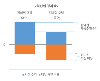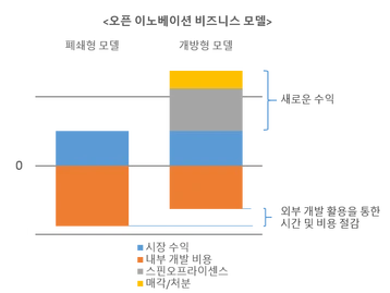 다음의 그래프는 폐쇄형 혁신 모델을 오픈 이노베이션 비즈니스 모델과 비교한 것이다. 오픈 이노베이션 비즈니스 모델은 라이센스 판매나 원천 기술의 매각 등의 수익원을 도입함으로써 폐쇄형 모델의 수익성 악화문제를 완화한다. 이같은 방식을 통해 외부에 개방된 원천소스는 기술 이해도 및 숙련도가 높은 사용자들에 의해 채택, 추가 개발되어 다양한 파생 기술을 낳는다. 결과적으로 기업은 추가개발에 소요되었을 비용 부담은 줄이고 파생 기술을 제품 개선에 반영하여 새로운 수익을 창출하게 된다. 물론 이렇게 개방되어 있는 원천소스와 파생 기술은 경쟁자에게도 노출된다. 따라서 이전보다 더 빨리 시장에 경쟁제품이 쏟아진다. 하지만 시장에서의 제품수명주기 단축으로 인해 경쟁제품이 출시되기까지 걸리는 시간과 자사 제품이 시장에서 퇴출되기까지 걸리는 시간의 차가 크지 않으므로 경쟁 제품의 위협은 상대적으로 적다고 분석할 수 있다. 이상의 내용을 요약하면 오픈소스 하드웨어 개발 전략은, 기술개발 비용은 상승하고 비용회수 기간은 짧아진 시장환경에서 특허를 바탕으로 자사의 시장 독점 기간을 확보하는 전략은 비용 대비 효용이 낮다는 해석을 전제하고 있다. 차라리 기업 내부의 제품 개발 과정을 공개하고 아이디어의 발전을 가속화하면서 새로운 시장환경 적응 기전을 찾아야 한다는 것이다.
