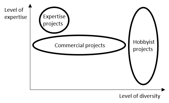 오픈소스 하드웨어 프로젝트가 성공적으로 운영되고 계획한 목표를 달성하는 데에는 프로젝트 참여자의 전문적 이해 수준, 그리고 프로젝트 결과물의 다양성이 영향을 미친다. 따라서 오픈소스 하드웨어 프로젝트를 기획하기에 앞서 각 요소에 대해 프로젝트가 목표로 하는 기대치를 설정해야 한다.*10) 아래 그림은 기획하고자 하는 프로젝트가 요구하는 참여자의 전문성 수준(세로축)과 목표하는 결과물의 다양성 수준(가로축)에 따라 오픈소스 프로젝트를 세 가지의 카테고리로 구분하고 있다. 그래프의 세 영역은 각각 Expertise projects 전문 프로젝트, Commercial projects 상업 프로젝트, Hobbyist projects 취미 프로젝트의 요구 수준을 나타낸다.