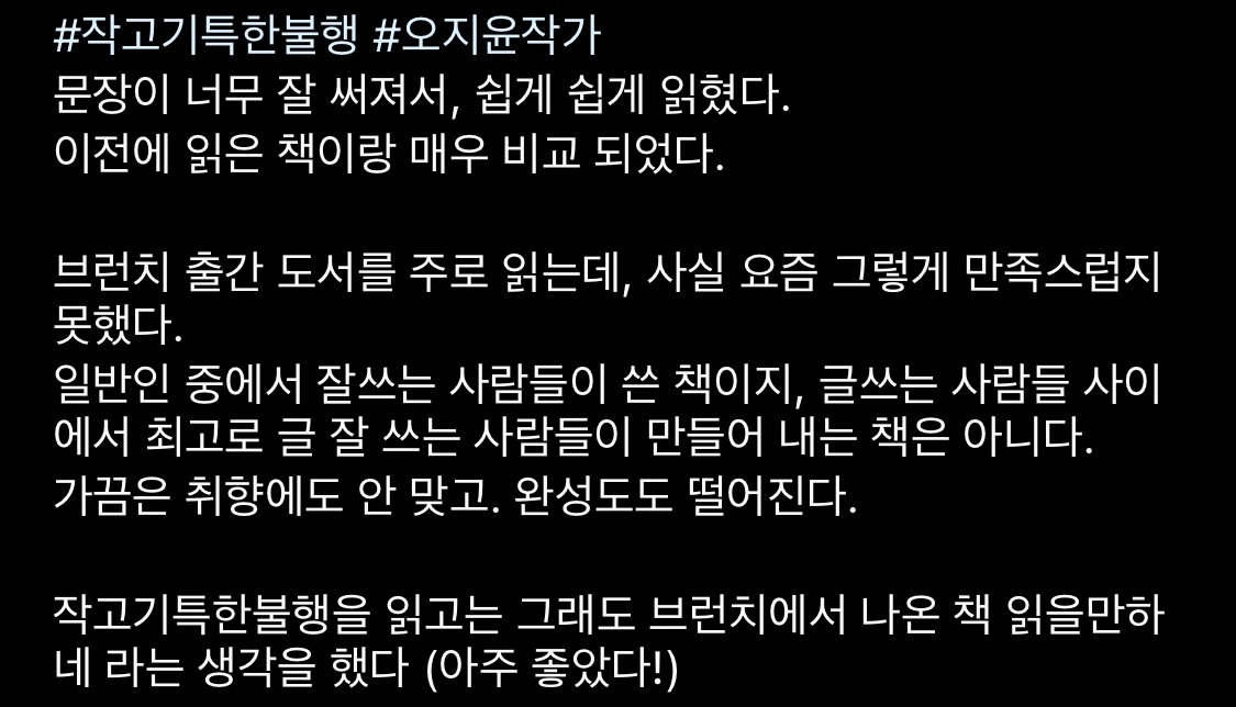 오탈자도 있고 분명 비문도 있고, 잘못된 내용도 있을 것이다. 뭐. 워낙 이런 리뷰 저런 리뷰 많이 봐서 그런가 보다 싶다가도 그게 브런치 관계자의 글이라니… 어차피 책이 나오면 “판매”라는 엄중한 평가를 받게 마련이라 왠만한 리뷰엔 덤덤했는데. 본중 제일 매서운 리뷰였다.