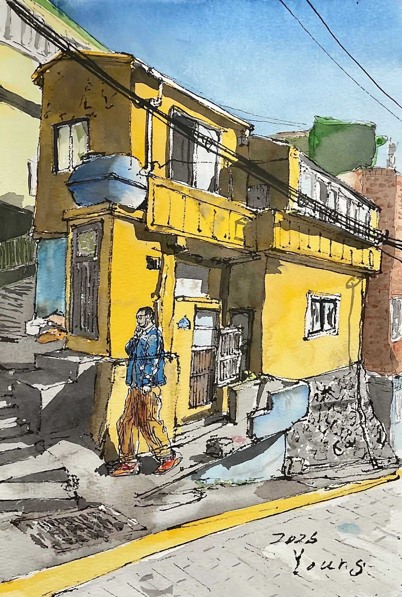 그리는 과정에서 실수가 있었다. 골목을 걷는 사람을 한 명 그려 넣었는데, 주변 집들에 비해 터무니없이 크게 그려진 것이다. 작은 동화 마을에 불시착한 거인처럼 비율이 어긋났다. "망했네." 작게 읊조렸지만 멈추지 않았다. 이미 그어진 펜 선은 돌이킬 수 없는 시간과 같다. 나는 그 위에 붓을 들어 짙은 노란색 물감을 칠했다. '옐로우 딥'과 '옐로우 오커'가 섞인 색이 종이 위로 번졌다.