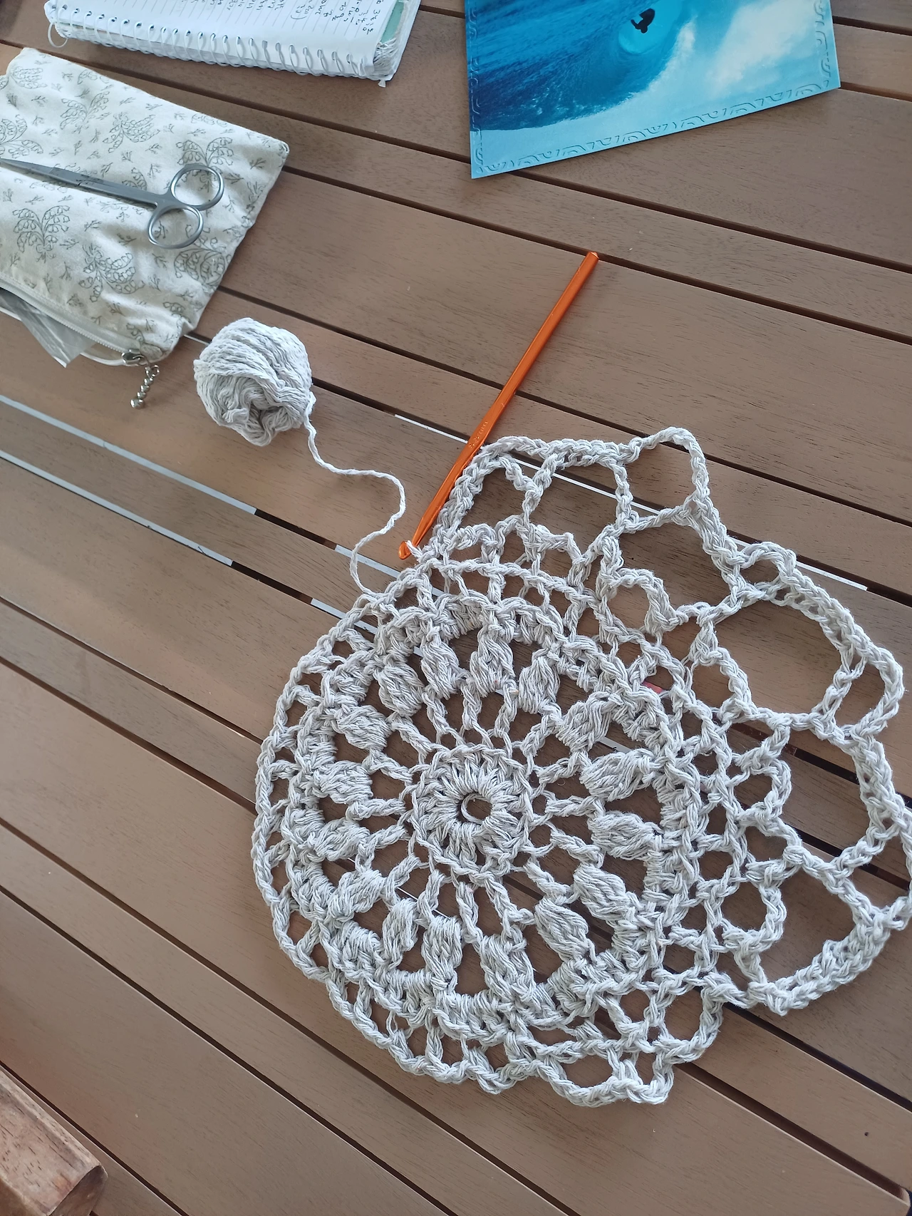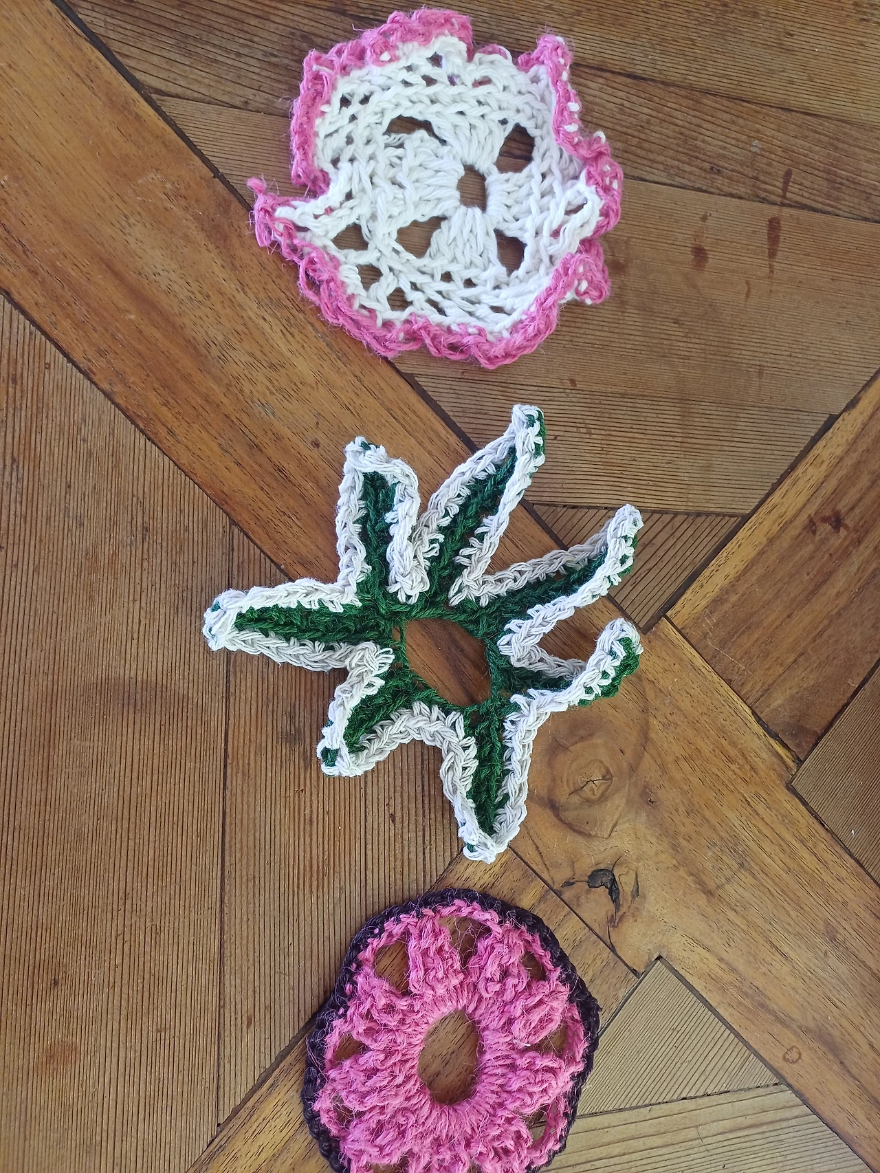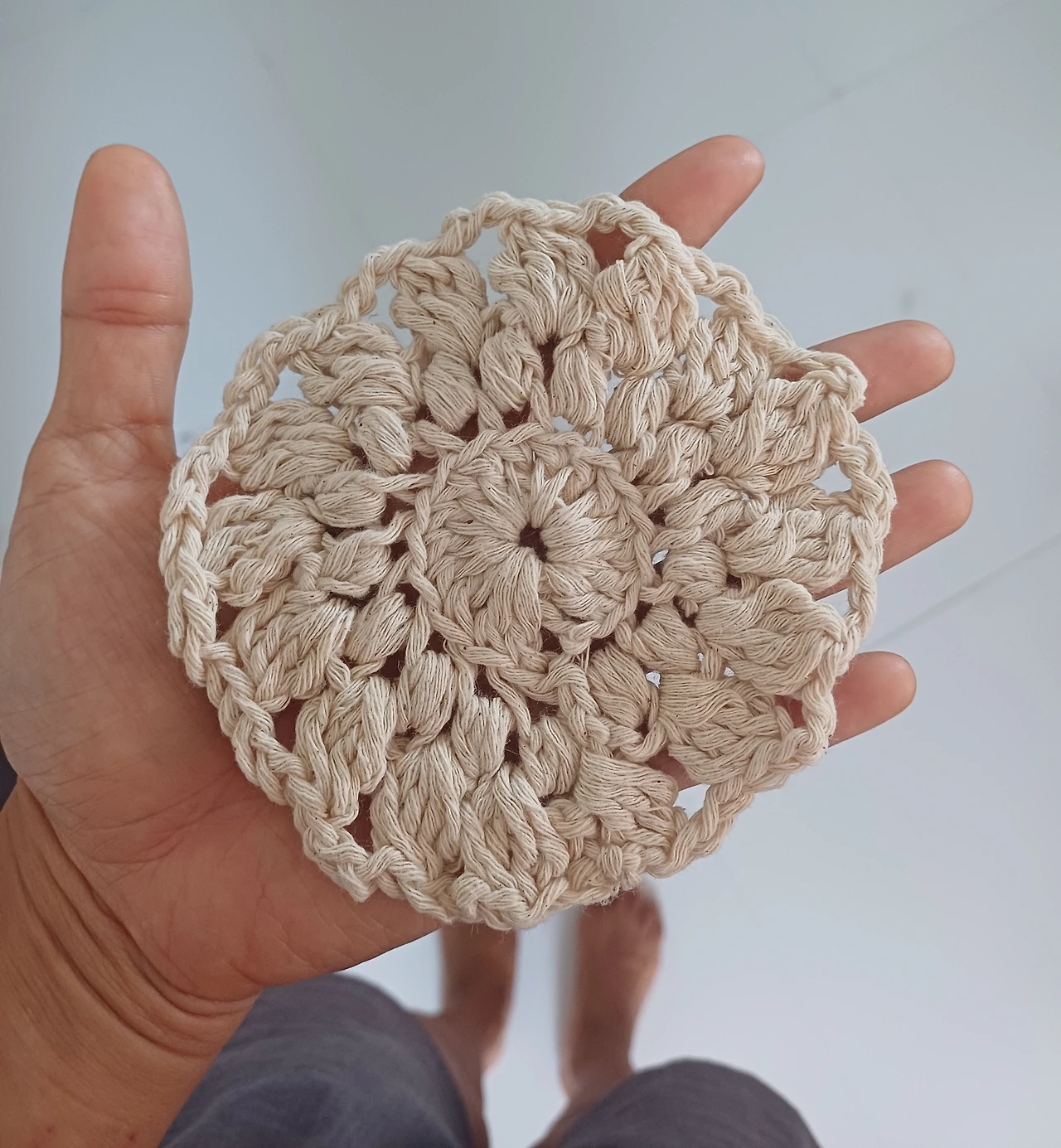 처음 뜬 모티프는 수세미로도, 컵받침으로도 쓸 만한 크기. 내 삶을 친절과 돌봄으로 채워 준 인연들에게 선물했다. 처음 머문 숙소 주인 갈린, 두 번째 숙소 관리인 마리멜과 정원사 피터. 까미긴에서는 늘 가던 밥집 삼춘, 다이빙 버디. 비행기 환승으로 하루를 머문 라로통가에서 우연히 만나 집으로 초대해 주고 잘 곳을 내어준 옥스에게 주려고 새벽에 일어나 후다닥 만든 적도 있다. 진심으로 그 사람이 행복하길 바라는 염원을 담아 만들려 애썼다. 이건 예술작품도 아니고, 소비도 생산도 노동도, 감히 폭력도 아니라고 믿고 싶다. '빈 시간'을 그저 한 땀 한 땀 눈에 보이게 표현한 만다라(mandala)에 가깝다.