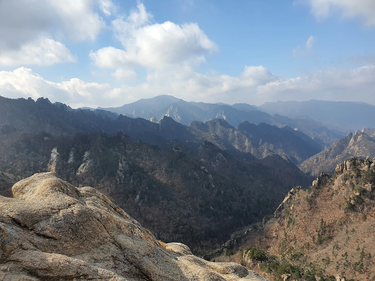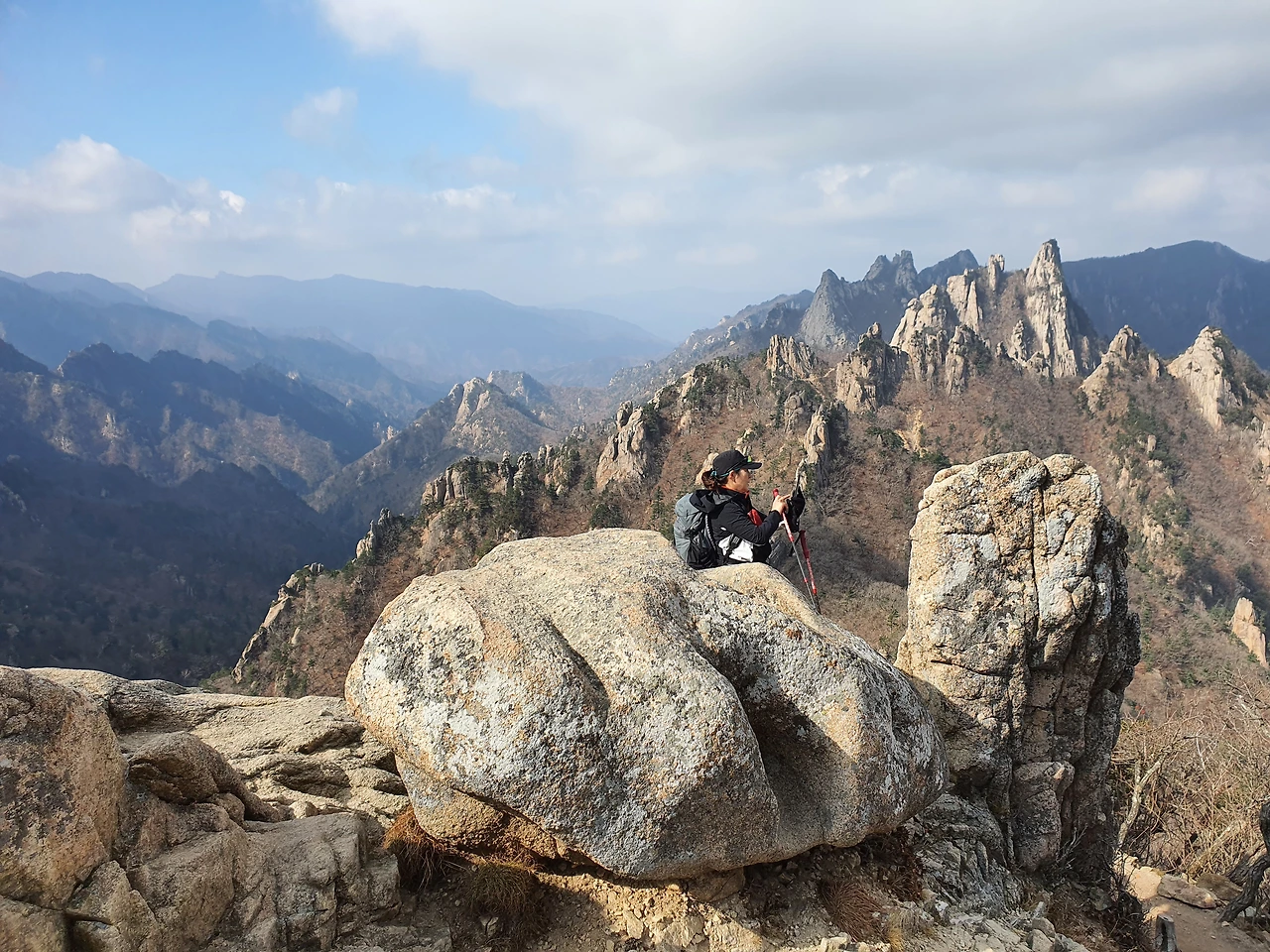 실제로 눈앞에 펼쳐지는 전망은 사진으로 다 담기지가 않는다. 능선 하나를 넘어 내려오다 보면 새로 시작되는 능선을 볼 수 있다. 산 전체가 돌로 되어 있기 때문에 멀리서도 능선의 윤곽은 볼 수 있다는 점이 설악산 공룡능선의 매력이다. 앞에 놓인 돌을 보면서 우리가 타고 넘어야 할 능선이지만 멋져 보였다. 이런 산을 오르고 있다는 생각에 뿌듯함도 함께였다.