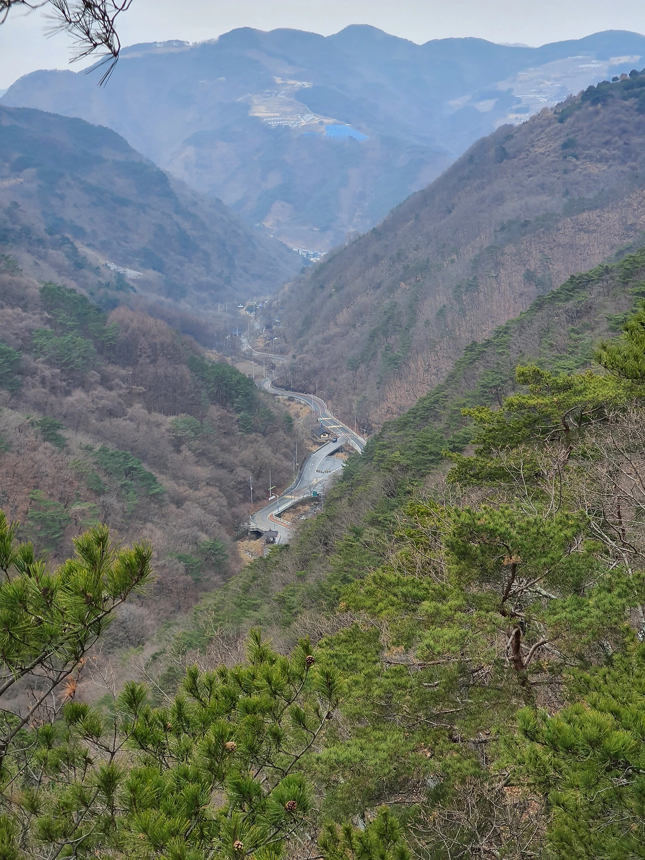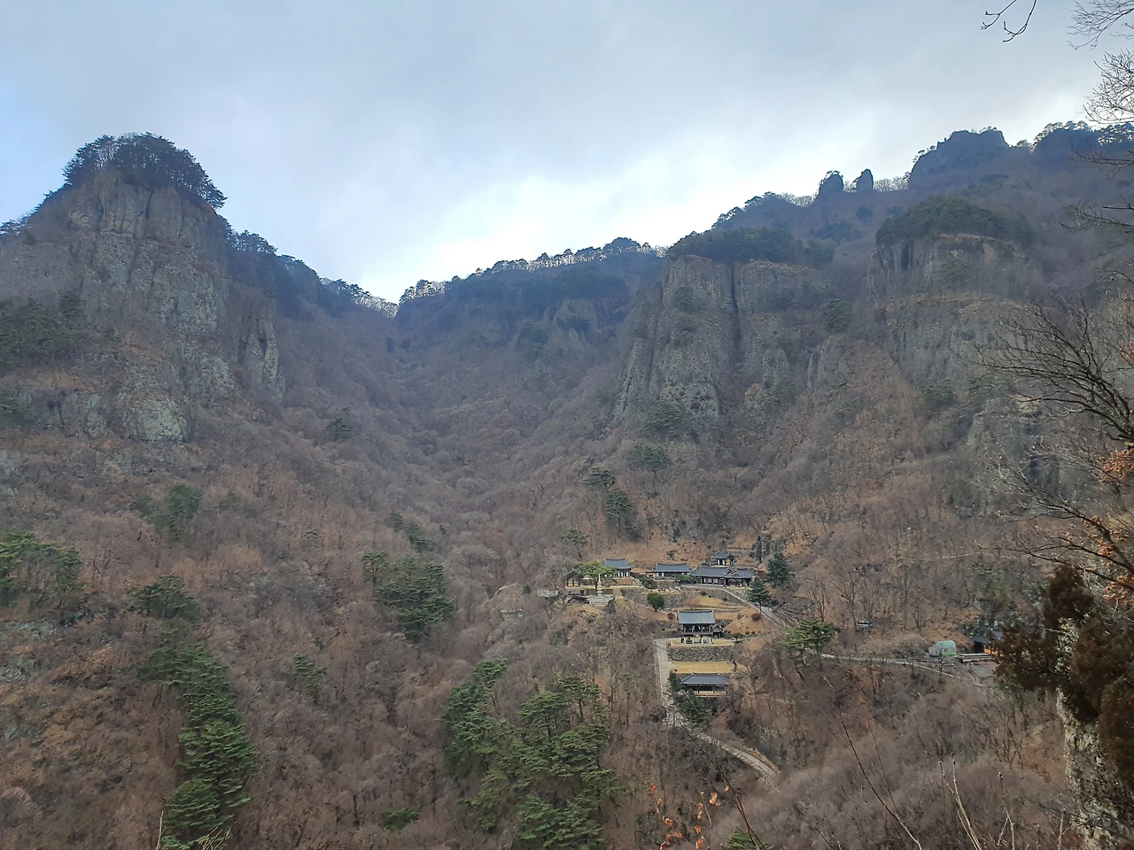 청량사로 내려오는 길을 하산 방향으로 잡고 한참을 내려왔다. 생각보다 골짜기가 깊어 내려오는 길도 경사가 높았다. 절의 기와가 보이고서야 안도할 수 있었다. 절까지 내려오는 도중에 아늑한 장소에 앉아 간단하게 식사를 했다. 날이 흐려 하늘은 어두웠지만 바람 한점 없이 포근한 기온 덕분에 편하게 쉬었다. 따뜻한 음식까지 먹고 내려오니 청량사가 더 반가웠다.